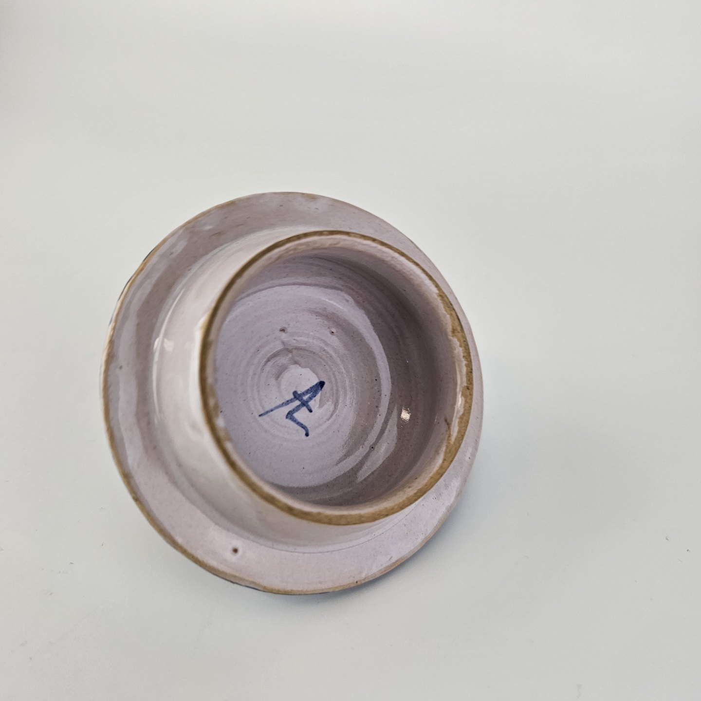 Fremstår med diverse små nister i overfladen og et hak i kanten ved åbningen