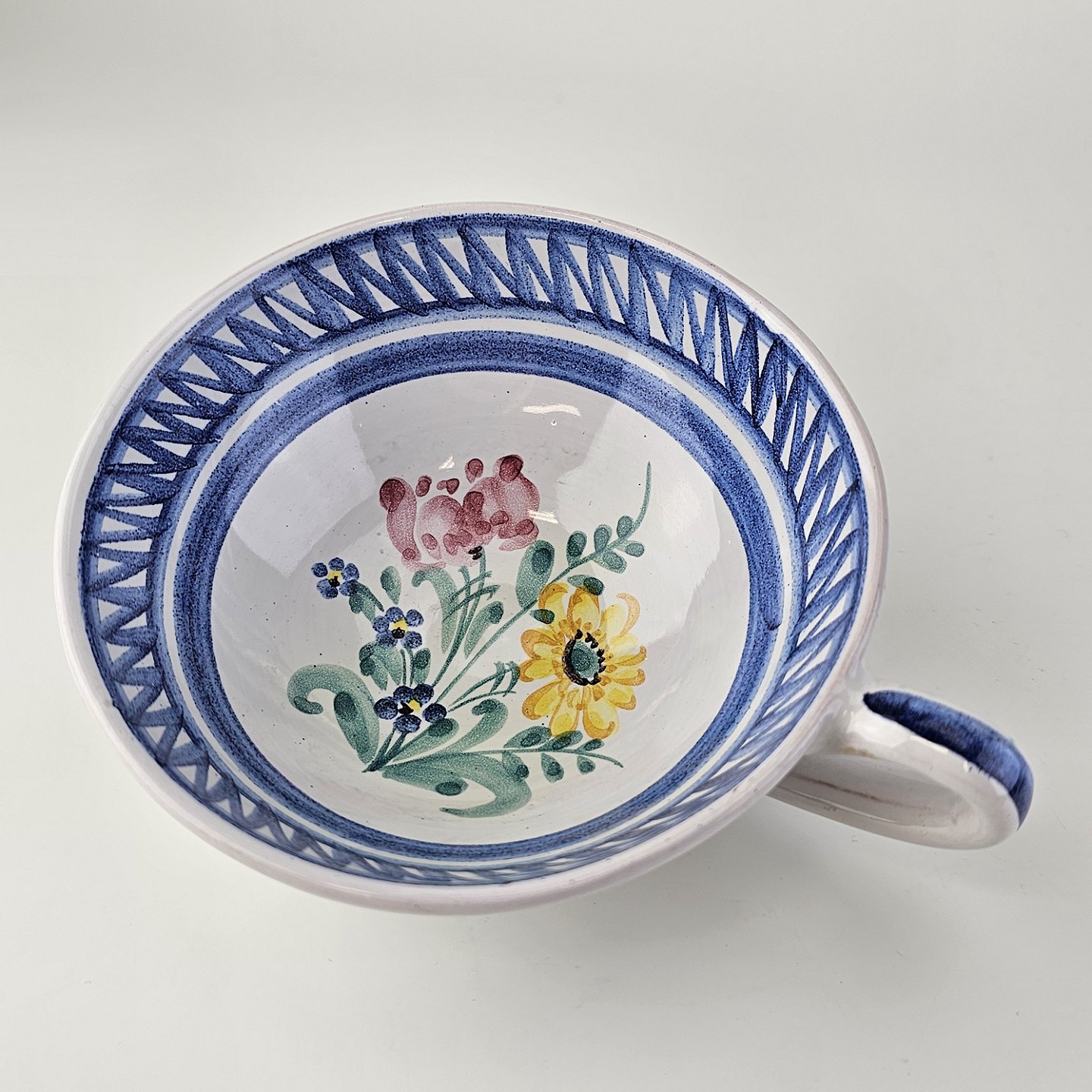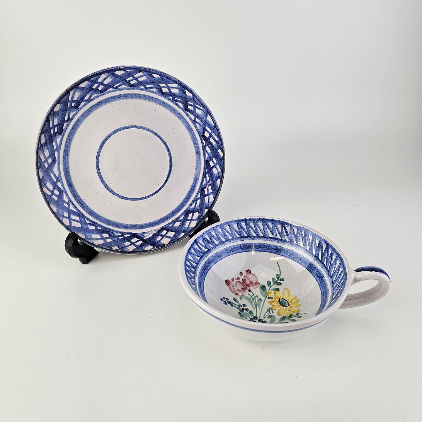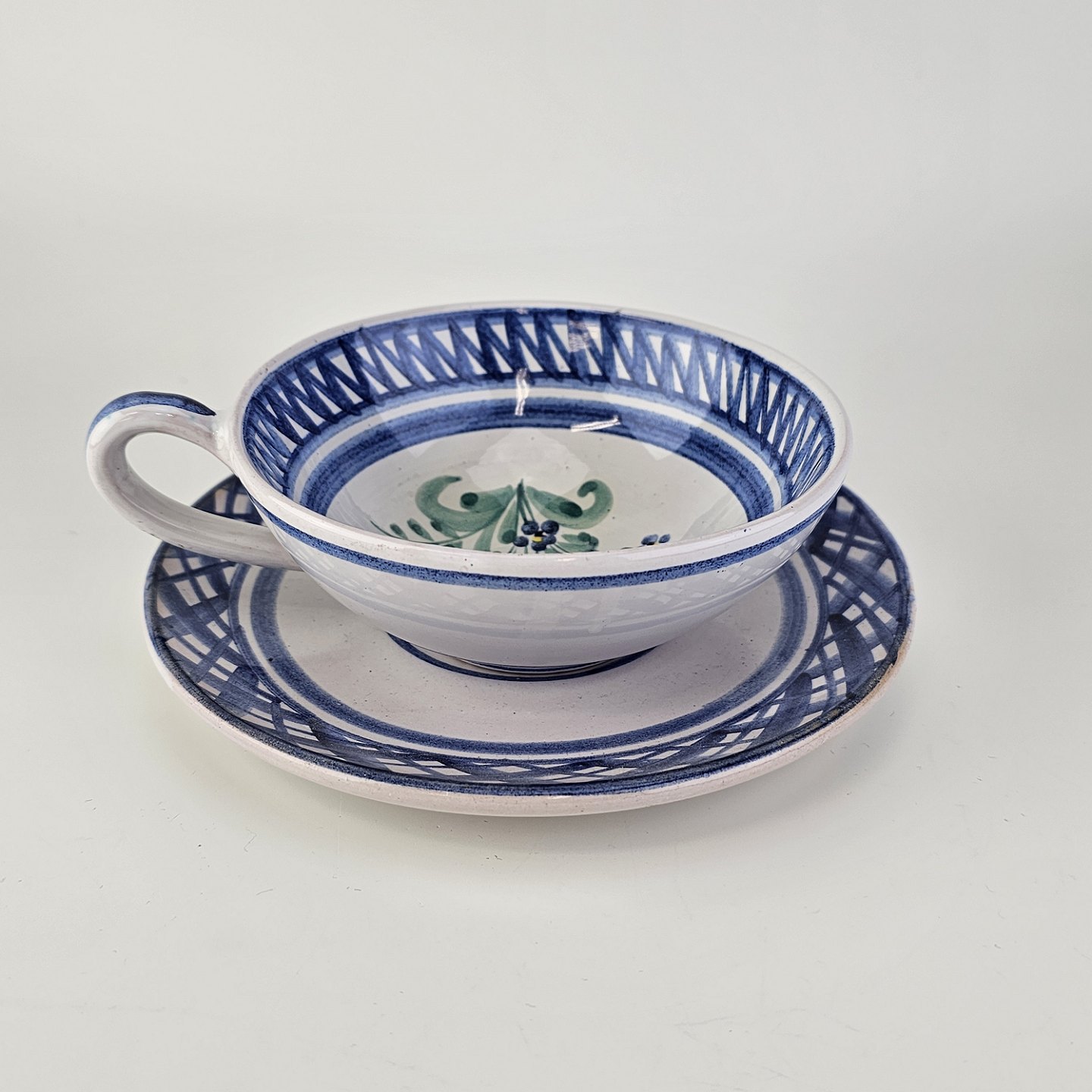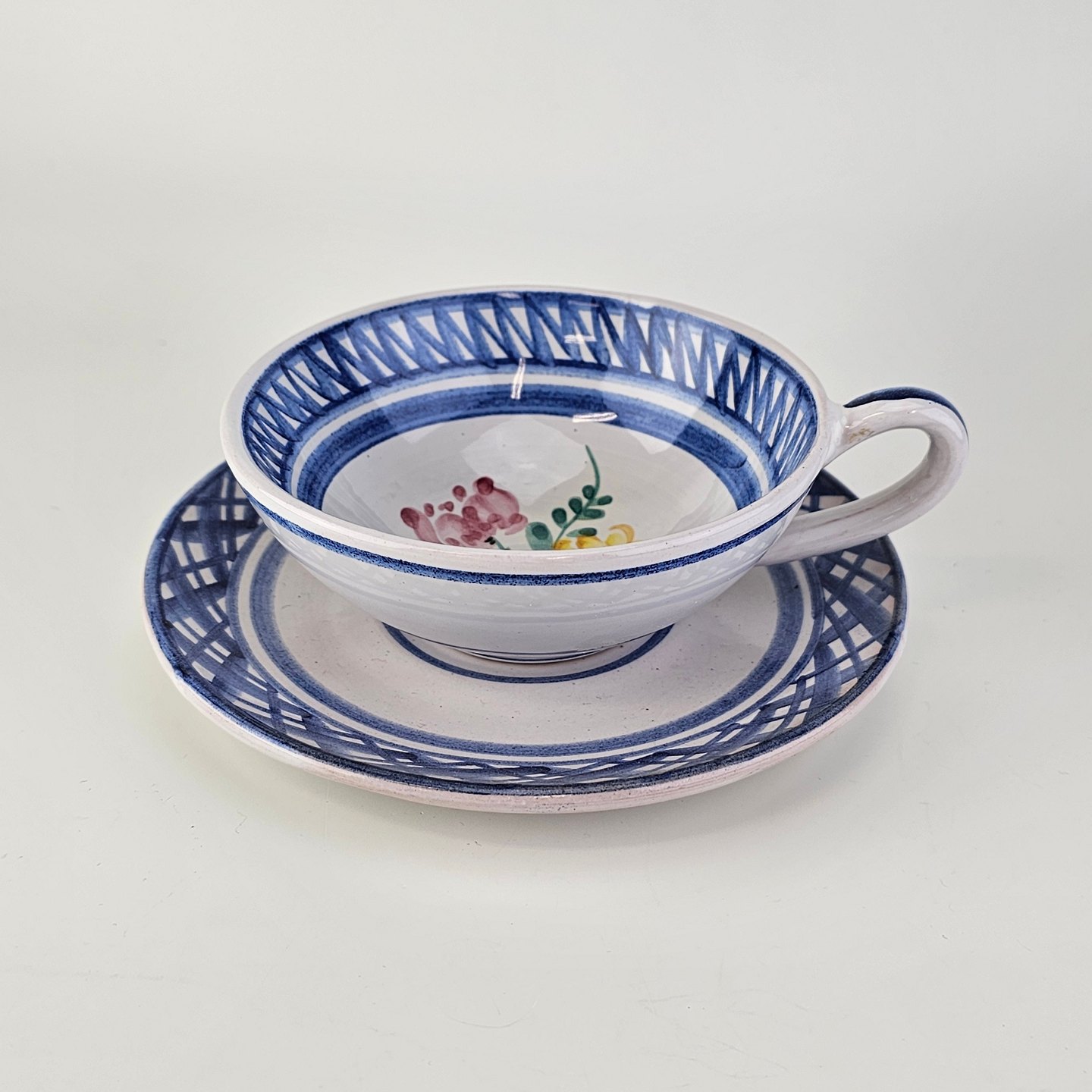 Kop og underkop i keramik med blå detaljer og blomsterdekoration