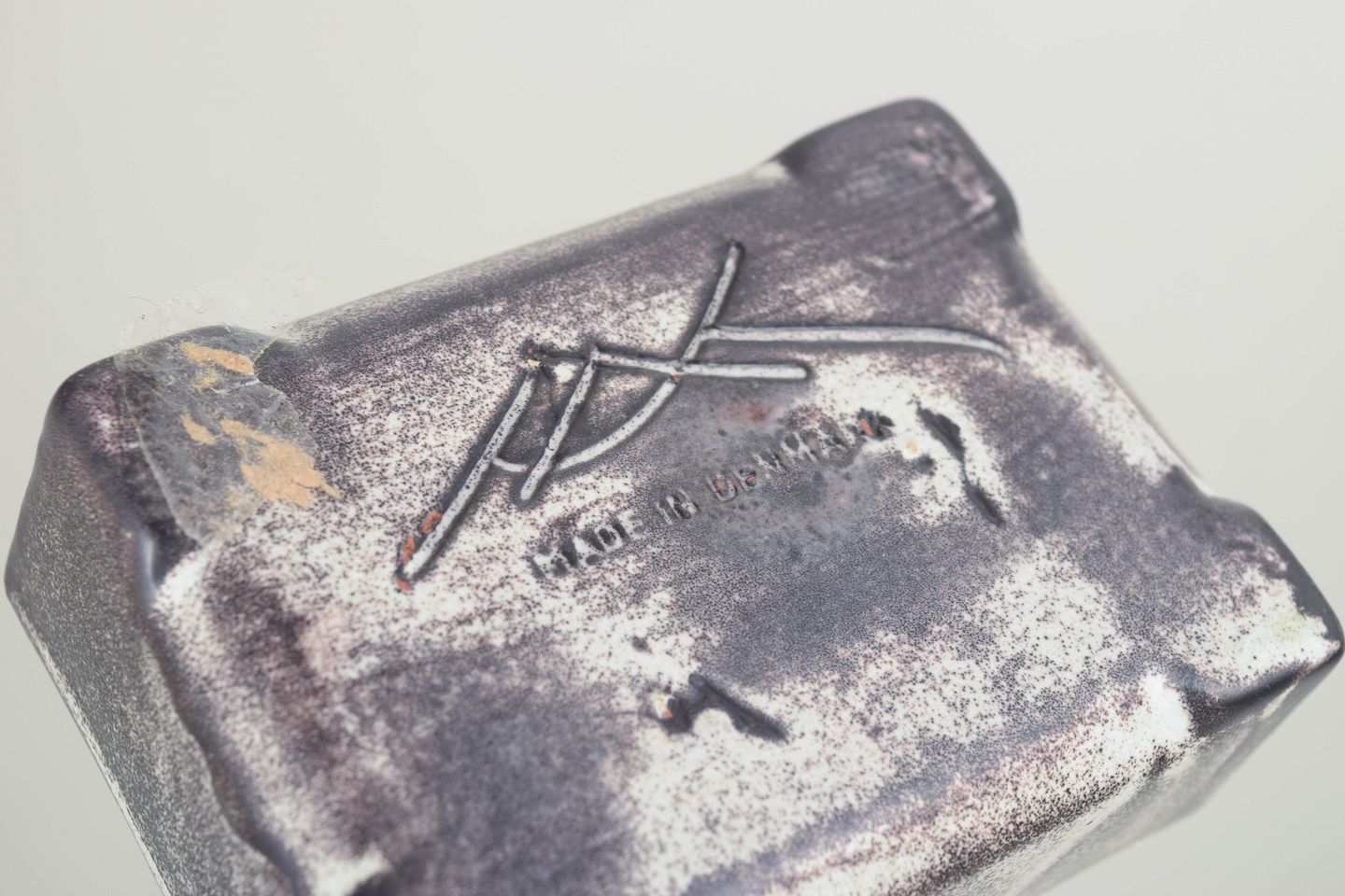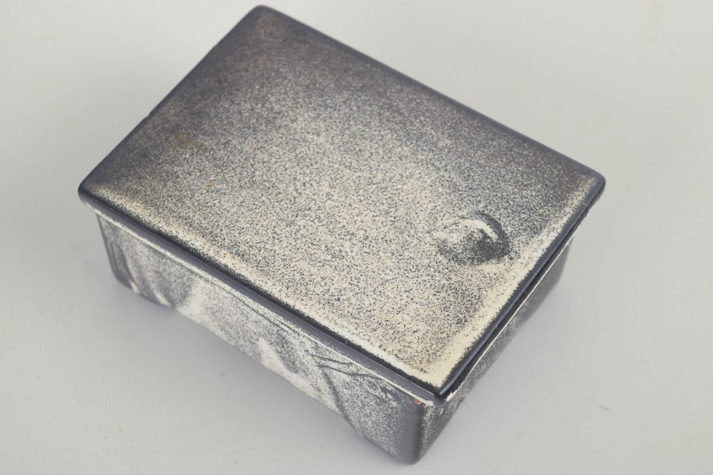 Rektangulær æske i stentøj med tilpasset låg, udført i en karakteristisk grå/sort dobbeltglasur med let metallisk virkning. Den stramme, arkitektoniske form og den stoflige glasuroverflade er typisk for Svend Hammershøis arbejder for Kähler i mellemkrigstiden, hvor funktion og æstetik forenes i en afdæmpet, tidløs helhed.