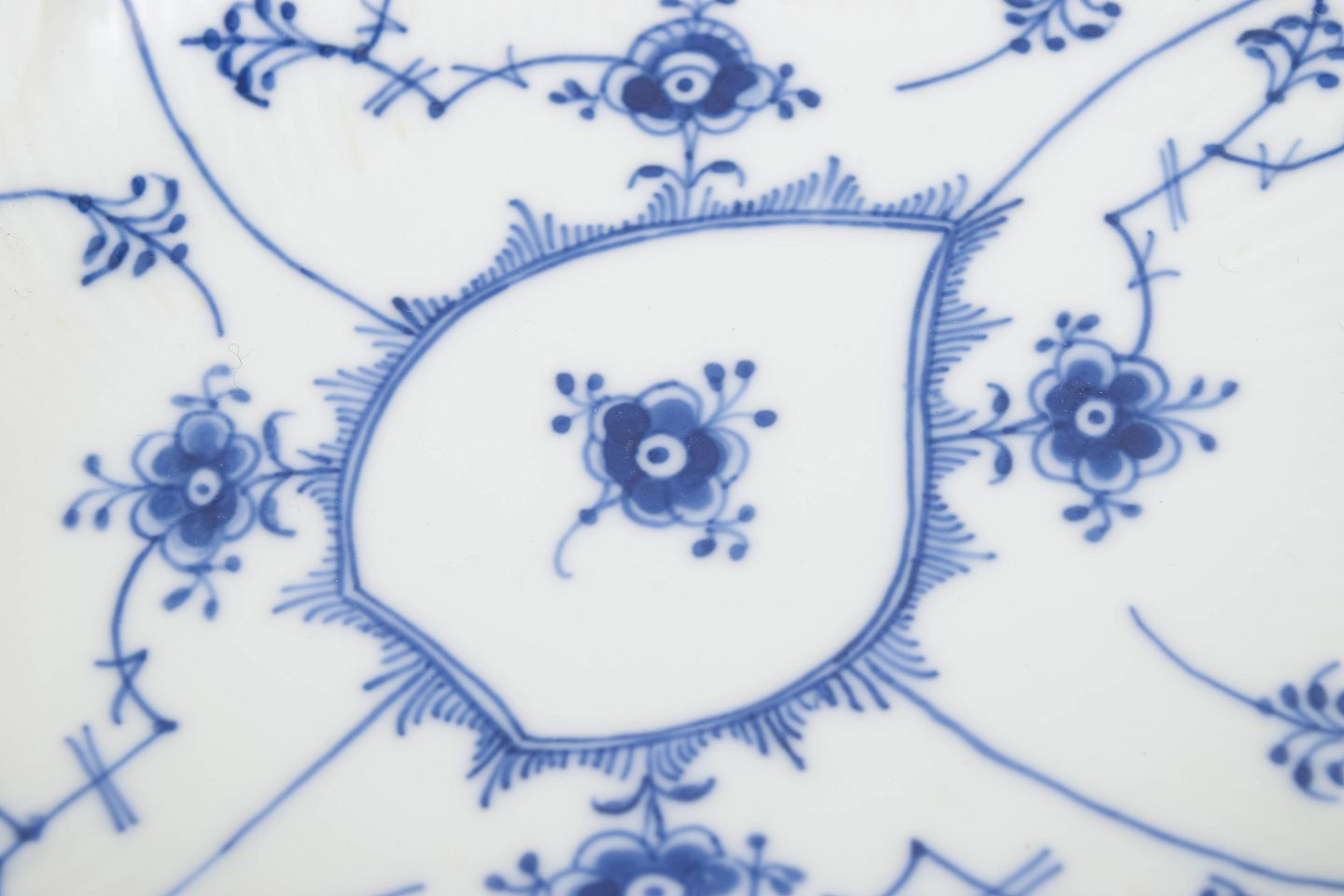 Musselmalet halvblonde blev introduceret i 1885 og repræsenterer en mere dekorativ fortolkning af det oprindelige Musselmalet stel. Kombinationen af den riflede form, blondekanten og den håndmalede dekoration gjorde stellet særligt populært i første halvdel af det 20. århundrede. Fade med hank som dette blev ofte anvendt til servering og er i dag eftertragtede samlerobjekter på grund af deres funktionelle og skulpturelle udtryk.
