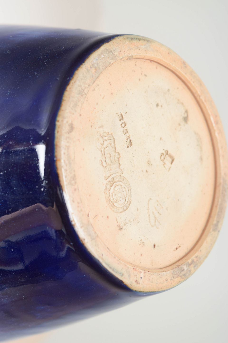 Elegant Art Nouveau-vase udført i glaseret stentøj med dyb blå løbende glasur og reliefdekorerede blomsterfelter i lyse og varme nuancer. Vasen har en harmonisk balusterform med let udadbøjet munding og fremstår som et klassisk eksempel på Royal Doultons dekorative produktion i mellemkrigstiden.