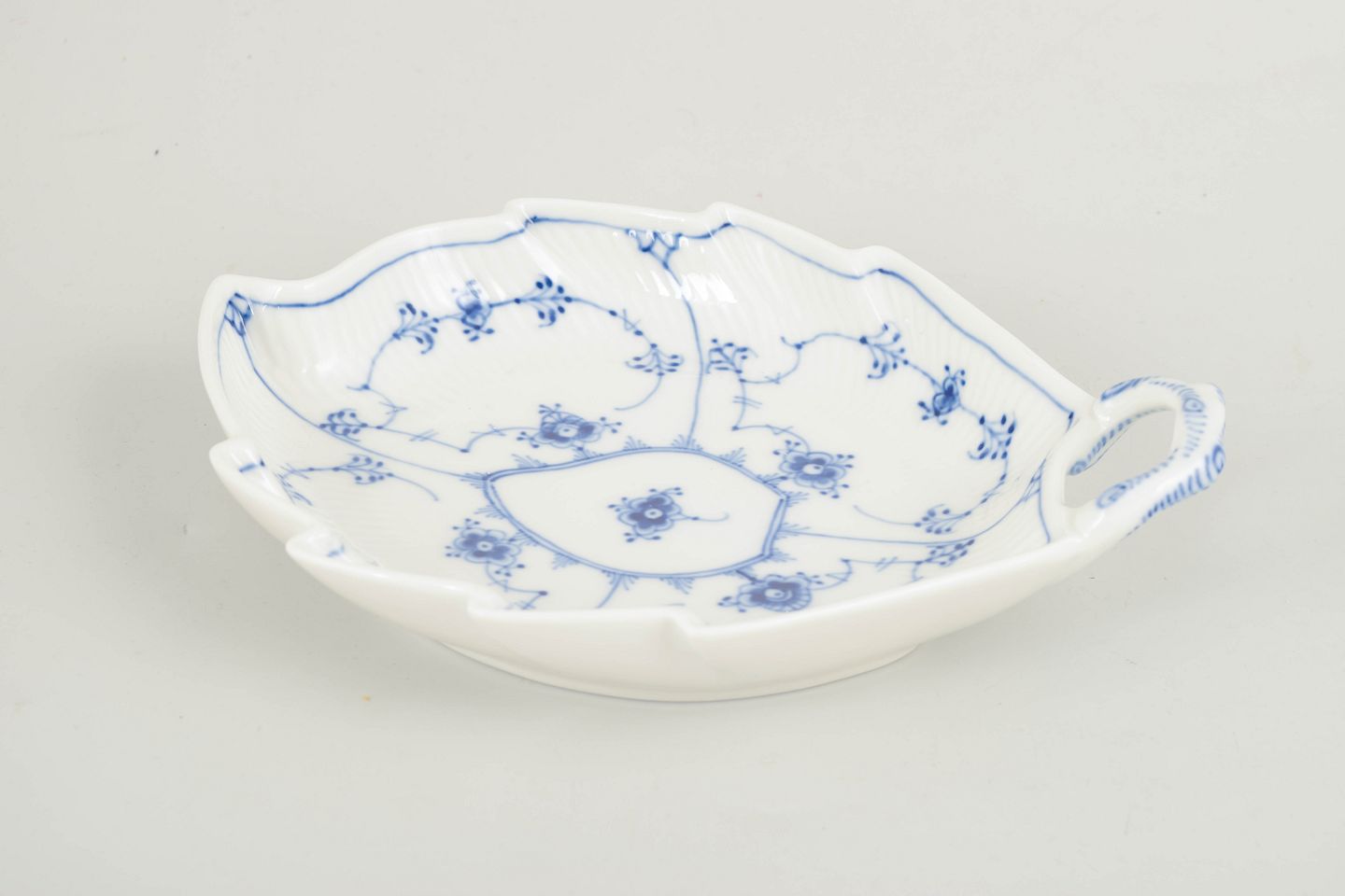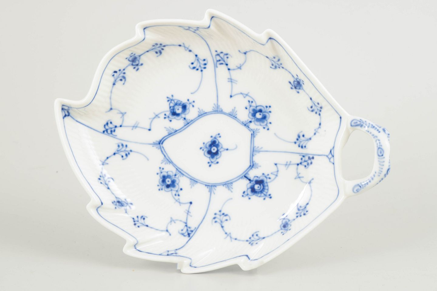 Dekorativt fad i Musselmalet Riflet, udført i bladformet model med integreret hank og let bølget rand. Fadet er dekoreret med håndmalet koboltblå underglasur i det klassiske musselmalede mønster og kombinerer en skulpturel form med praktisk anvendelse. En karakterfuld og relativt sjælden serveringsdel i stellet.