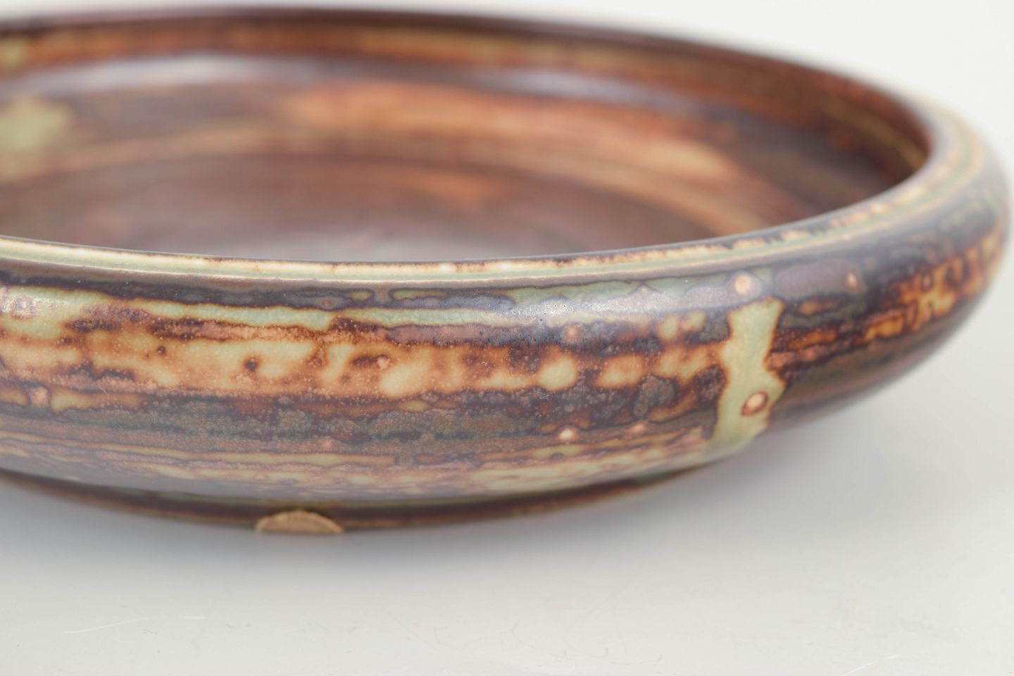 Lav, bred skål udført i stentøj med markant koncentrisk drejestruktur og dyb, levende glasur i mørke jordfarver med brune, sorte og varme okkerfarvede gennembrud. Overfladen fremstår taktil og grafisk med tydelige drejespor, som giver skålen et kraftfuldt og karakterfuldt udtryk.