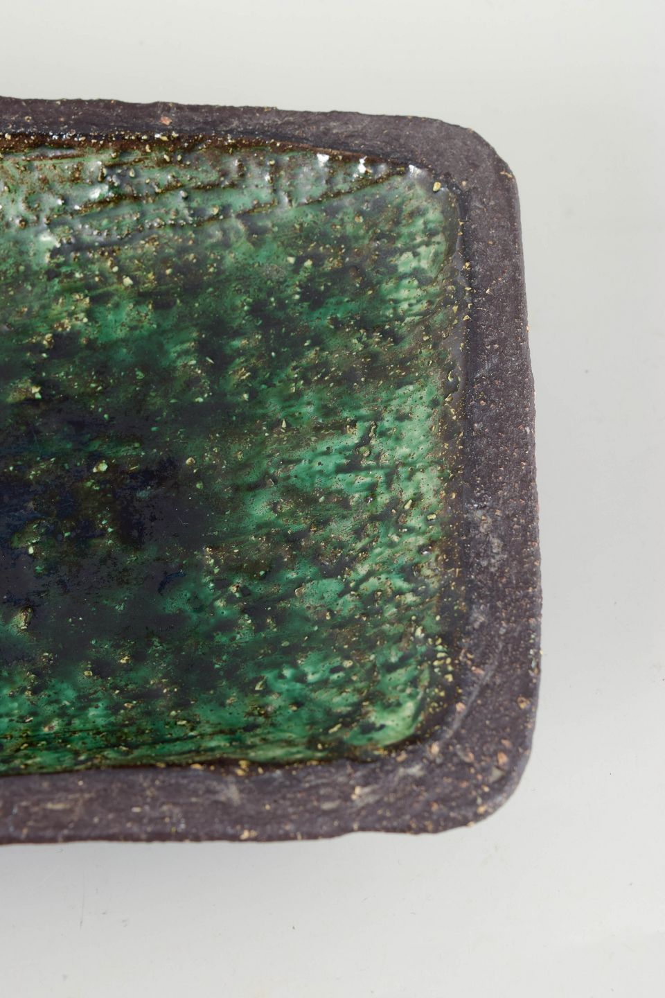Aflangt, hånddrejet stentøjsfad med let buet form og rå, uglaseret yderside. Indersiden er dækket af en levende grøn glasur med varierende dybde og struktur, karakteristisk for dansk studiokeramik fra perioden. Et dekorativt og funktionelt fad, velegnet til servering eller som skulpturelt midtpunkt.