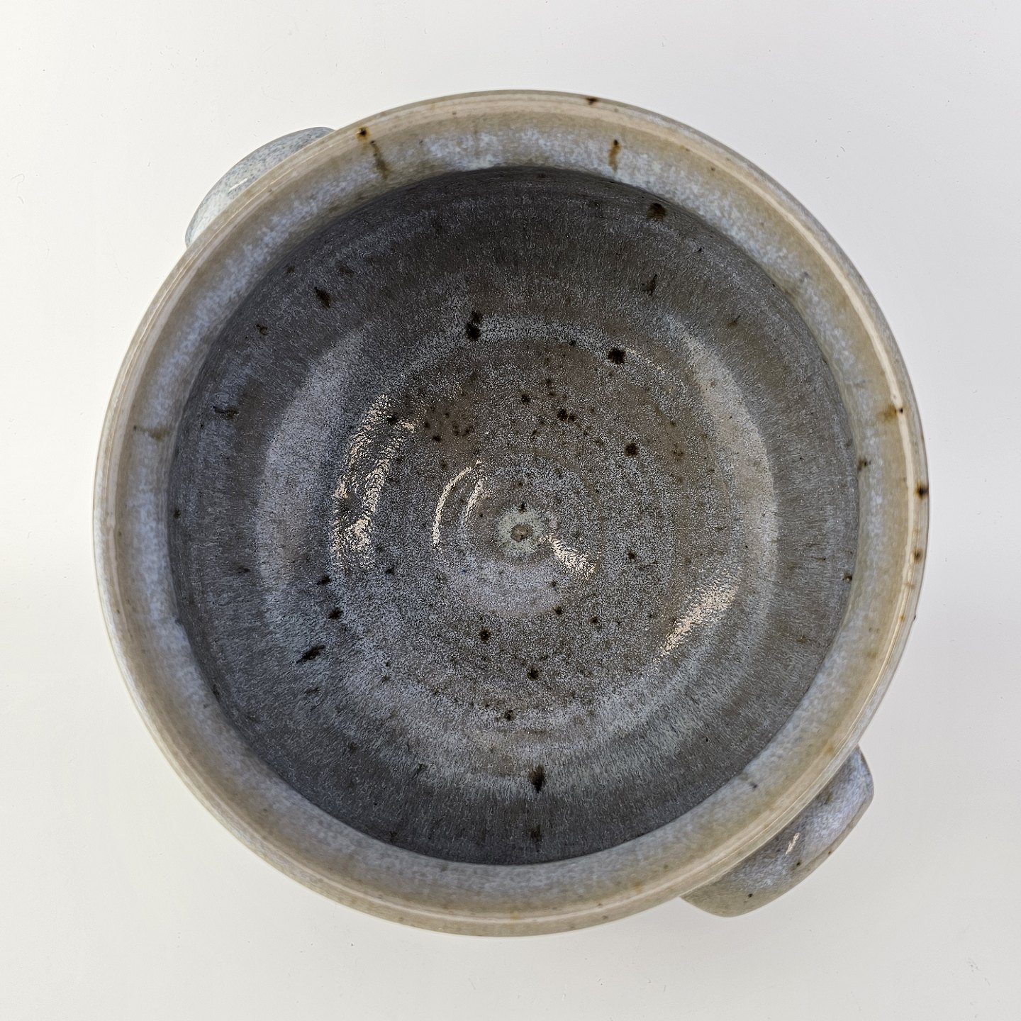 Blålig og grønlig keramik unika skål med 2 hanke med krakkeleringer i glasuren.