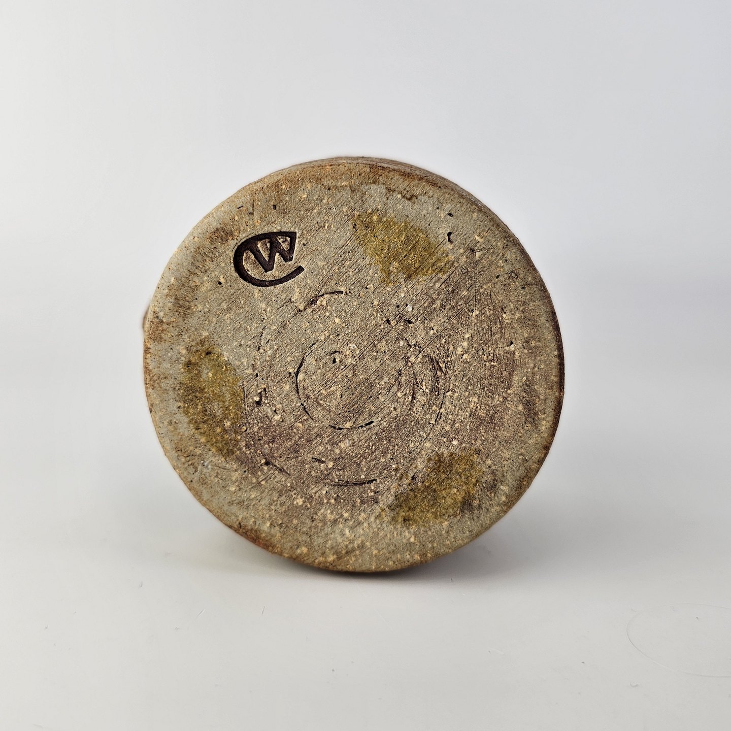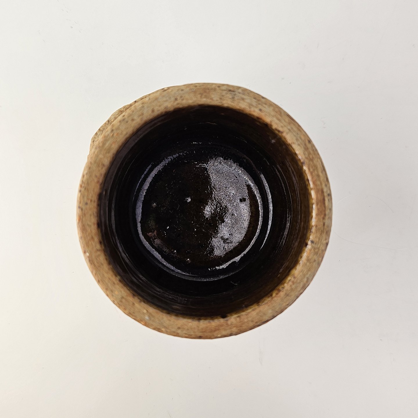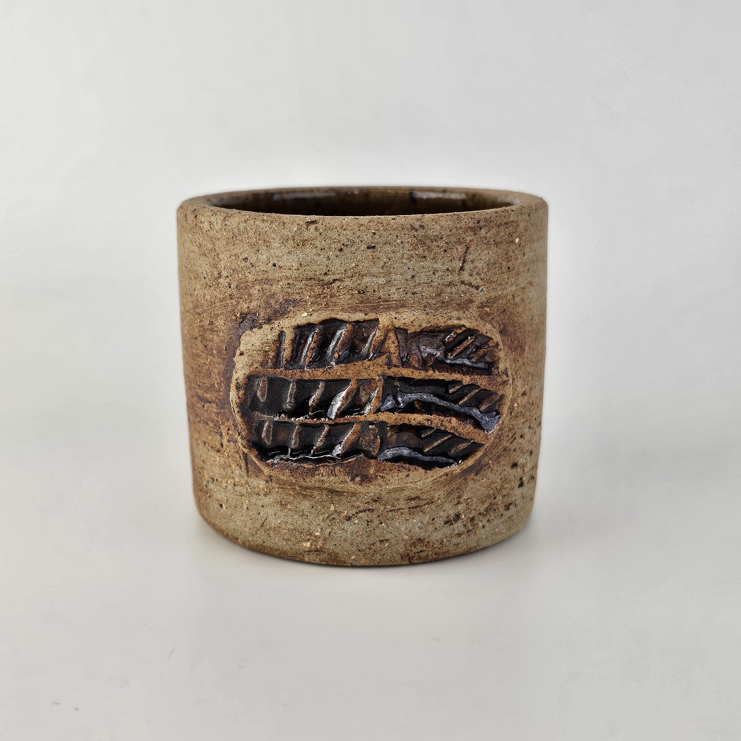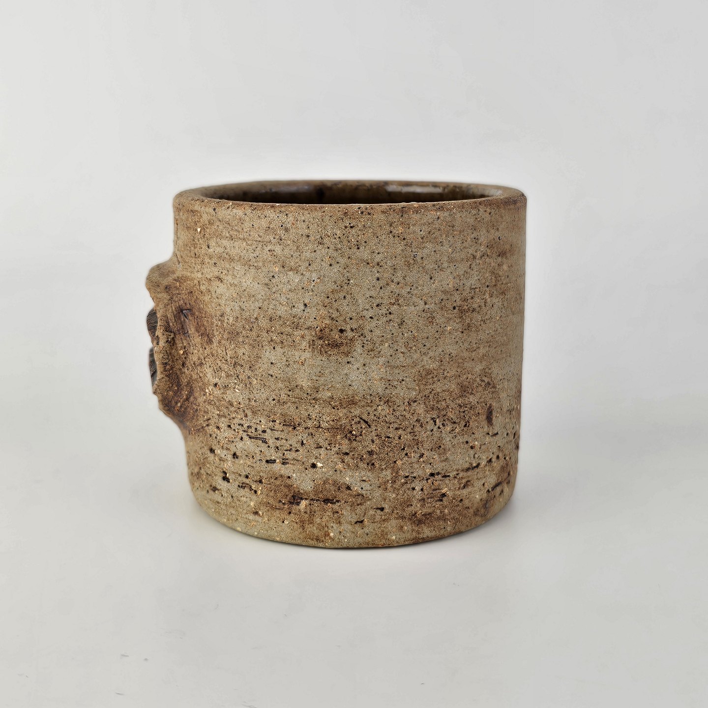 Brunlig krukke, krus, kop, vase med lille relief udvendigt. Den er uglasseret udvendigt