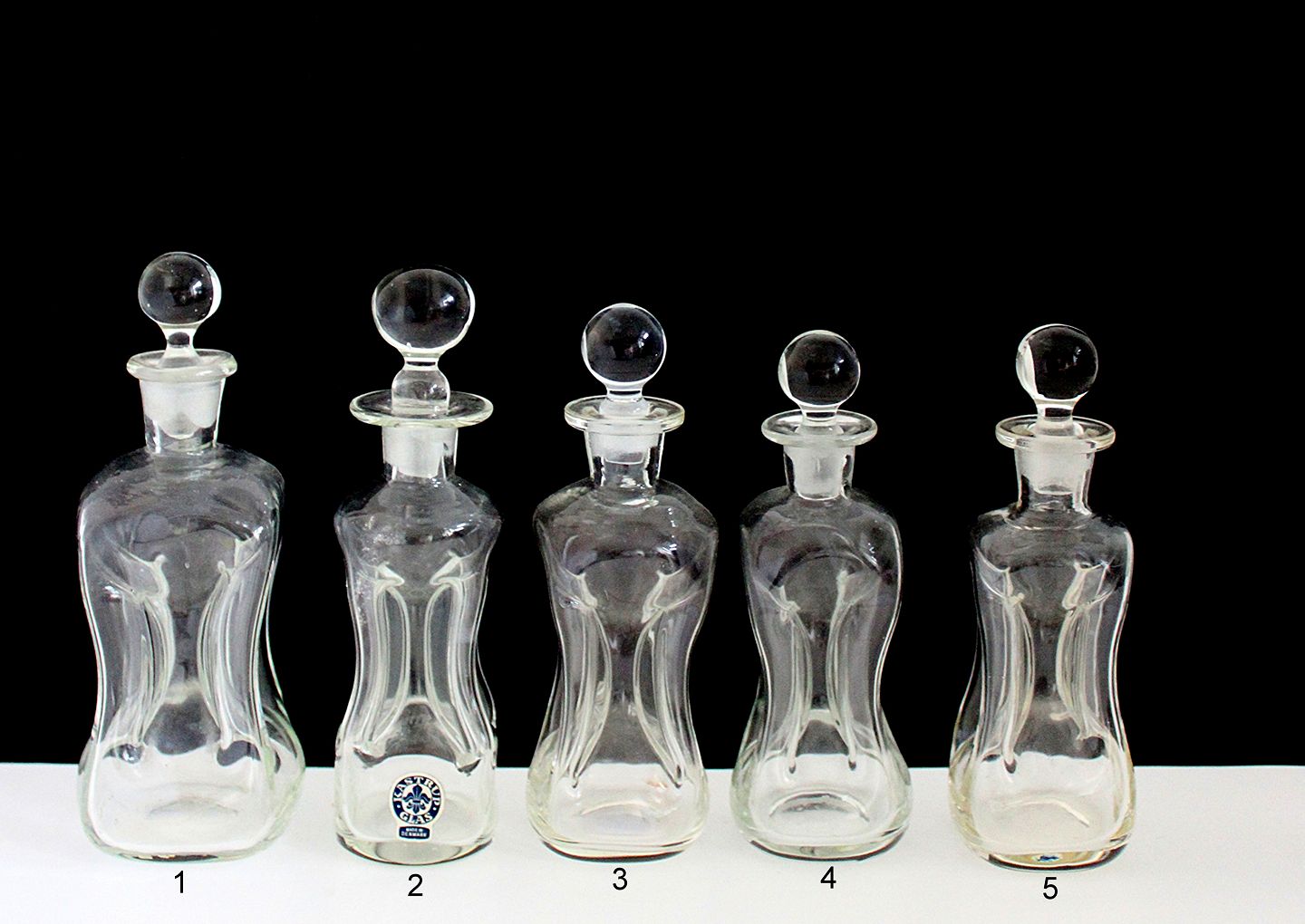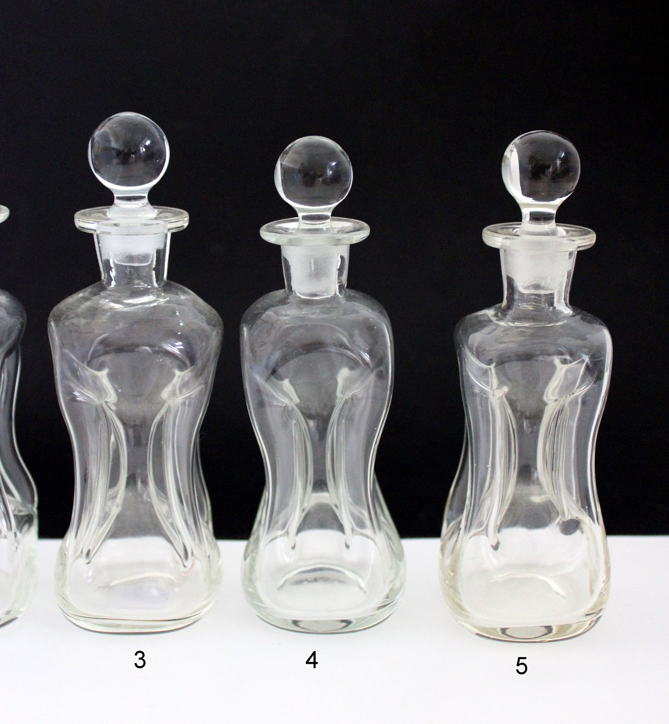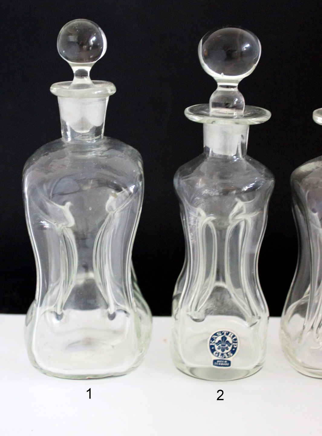 Kastrup/Holmegaard glasværk. Små kuvert klukflasker i klar glas. Almindelig brugsspor. Propperne formodes at høre til flaskerne fra start.