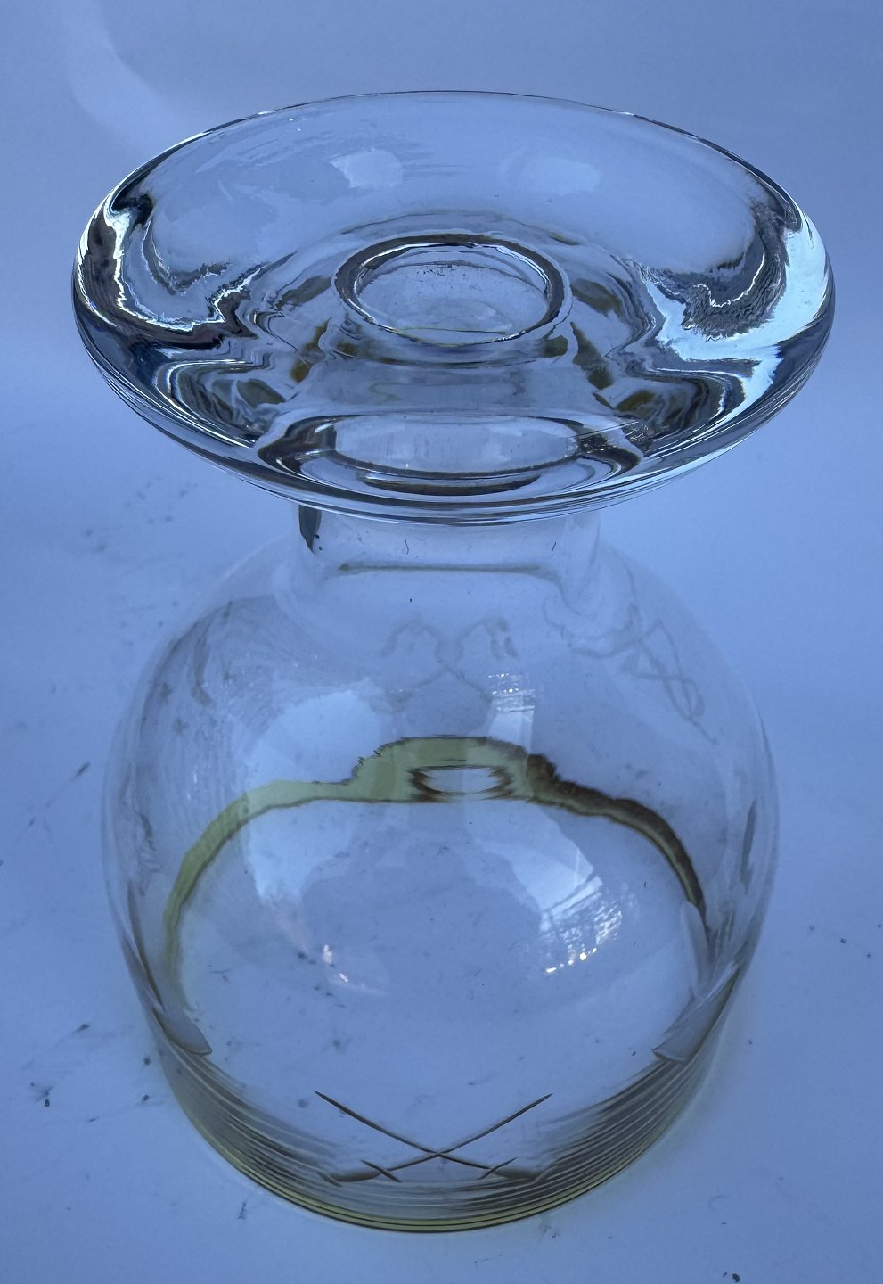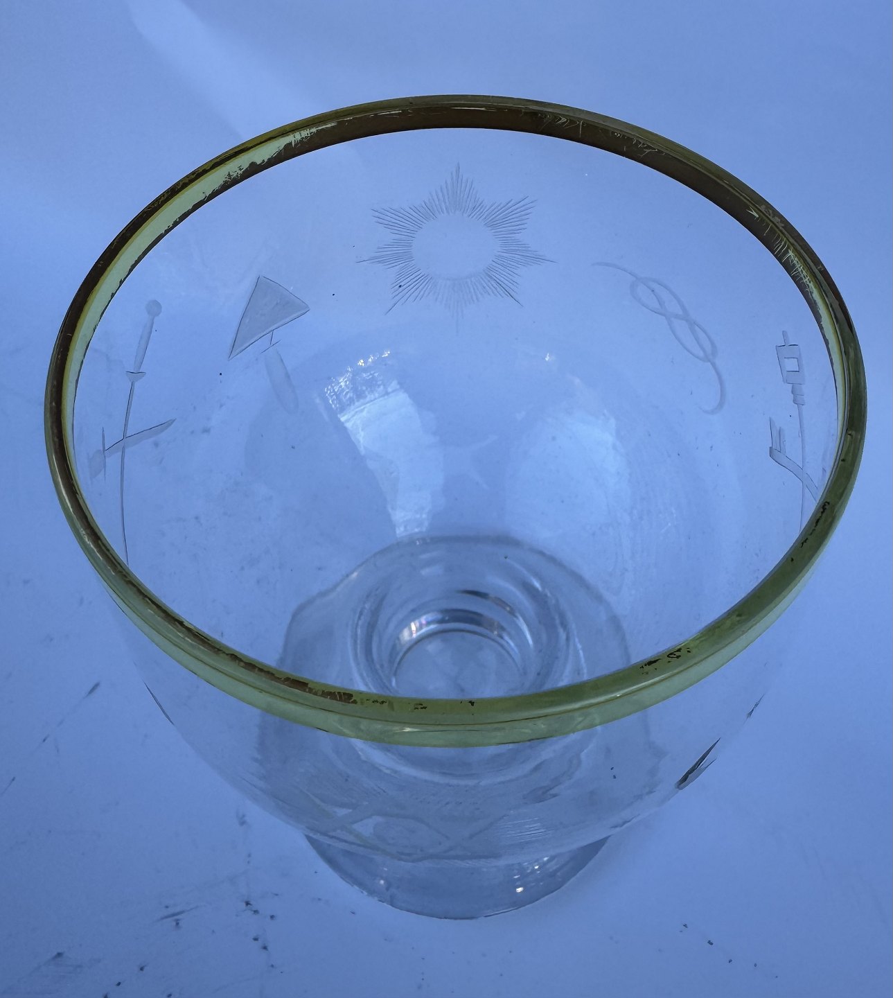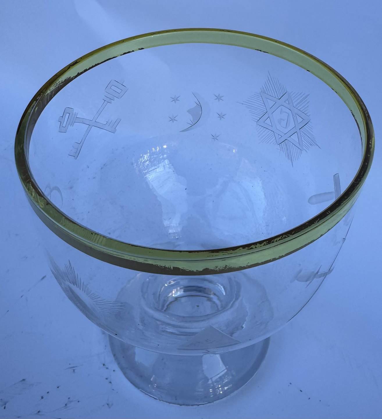 Big size drinking glass with gold rim. A fine glass for e.g. beer. Standing on a sturdy base. Engraved Masonic symbols around the glass. Appears in good condition. Presumably made in the 1930s. H. 14 cm.