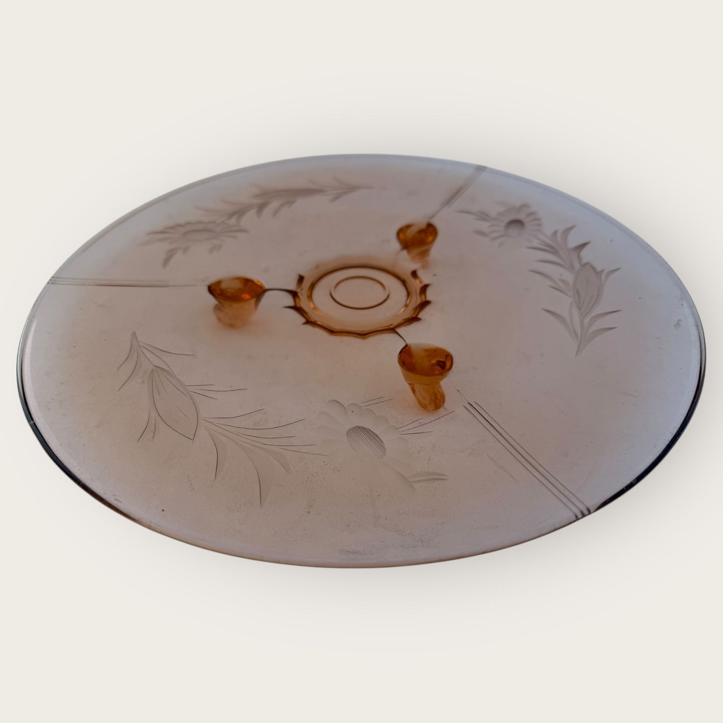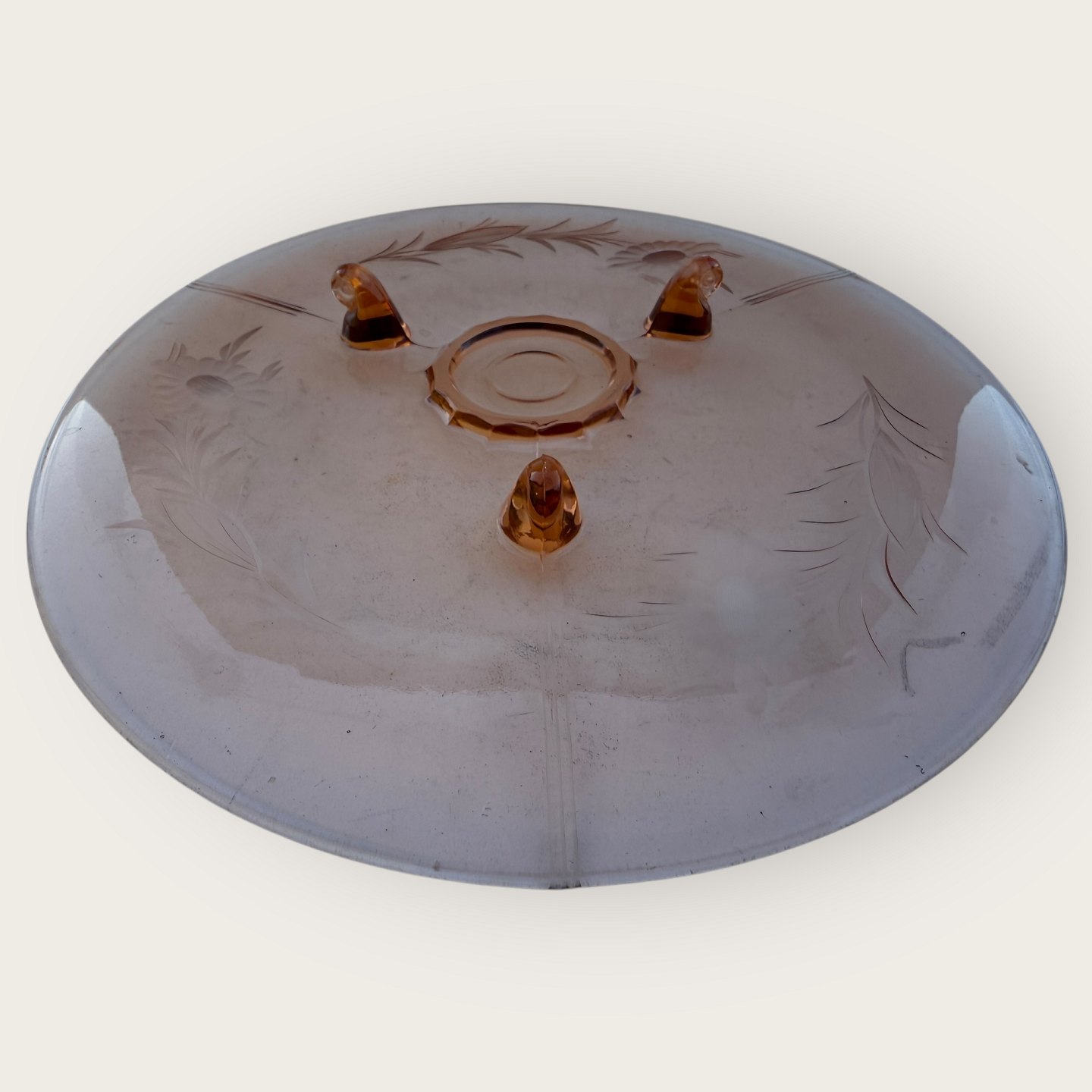 Rosa glasfad med blomsterslibninger og tre fødder, diameter 29cm *pæn stand*