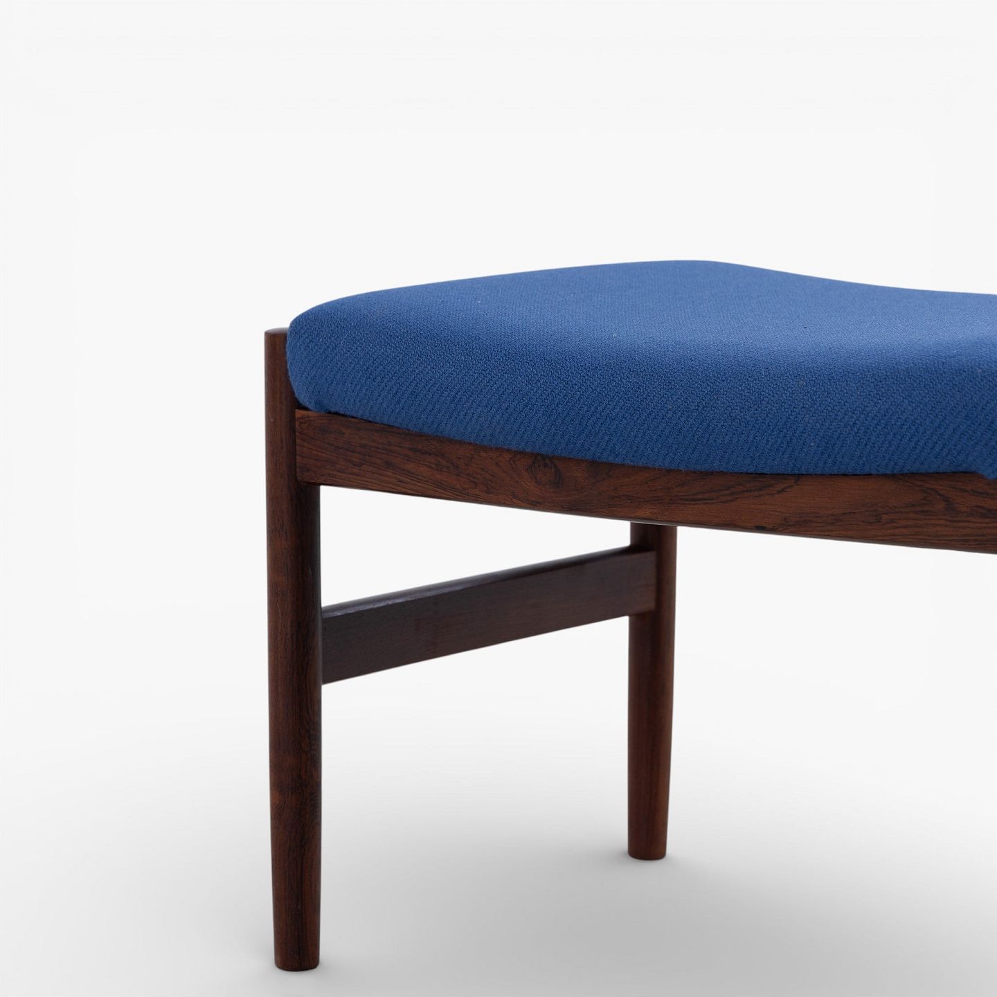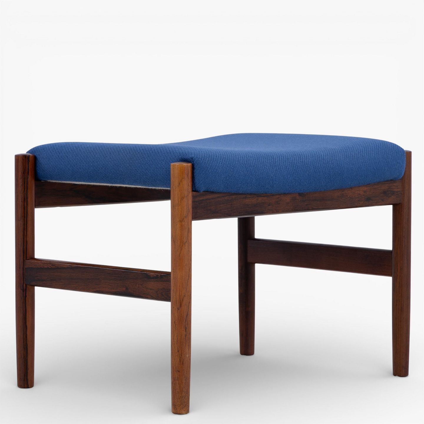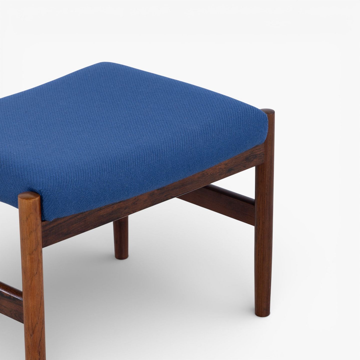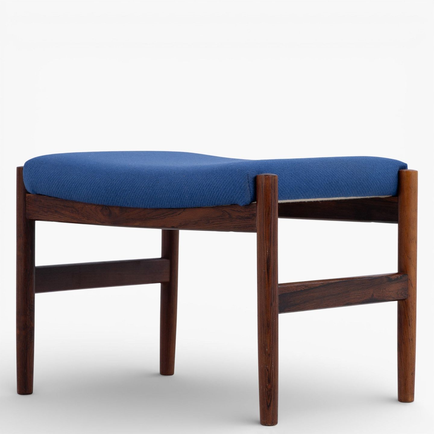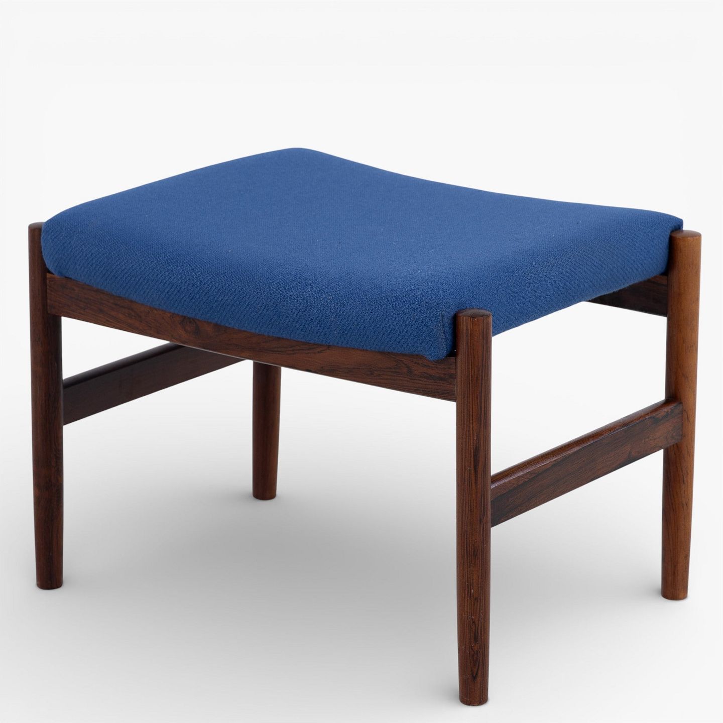 Fodskammel i patineret palisander betrukket med blå uld.