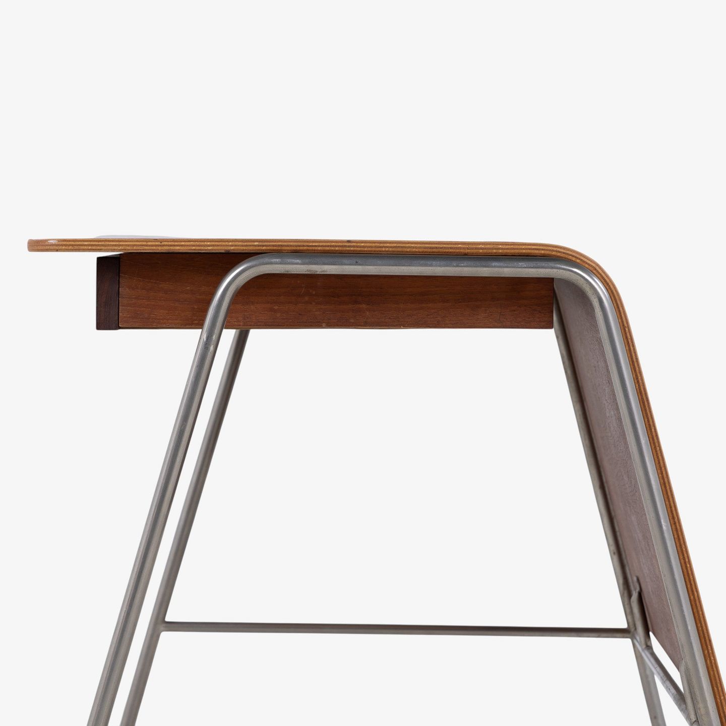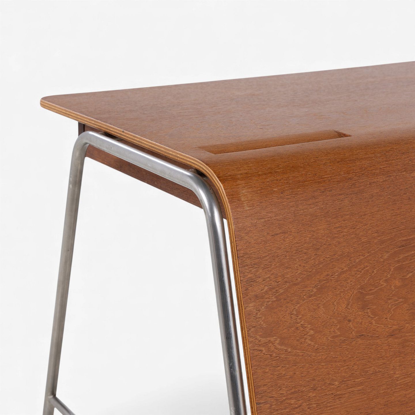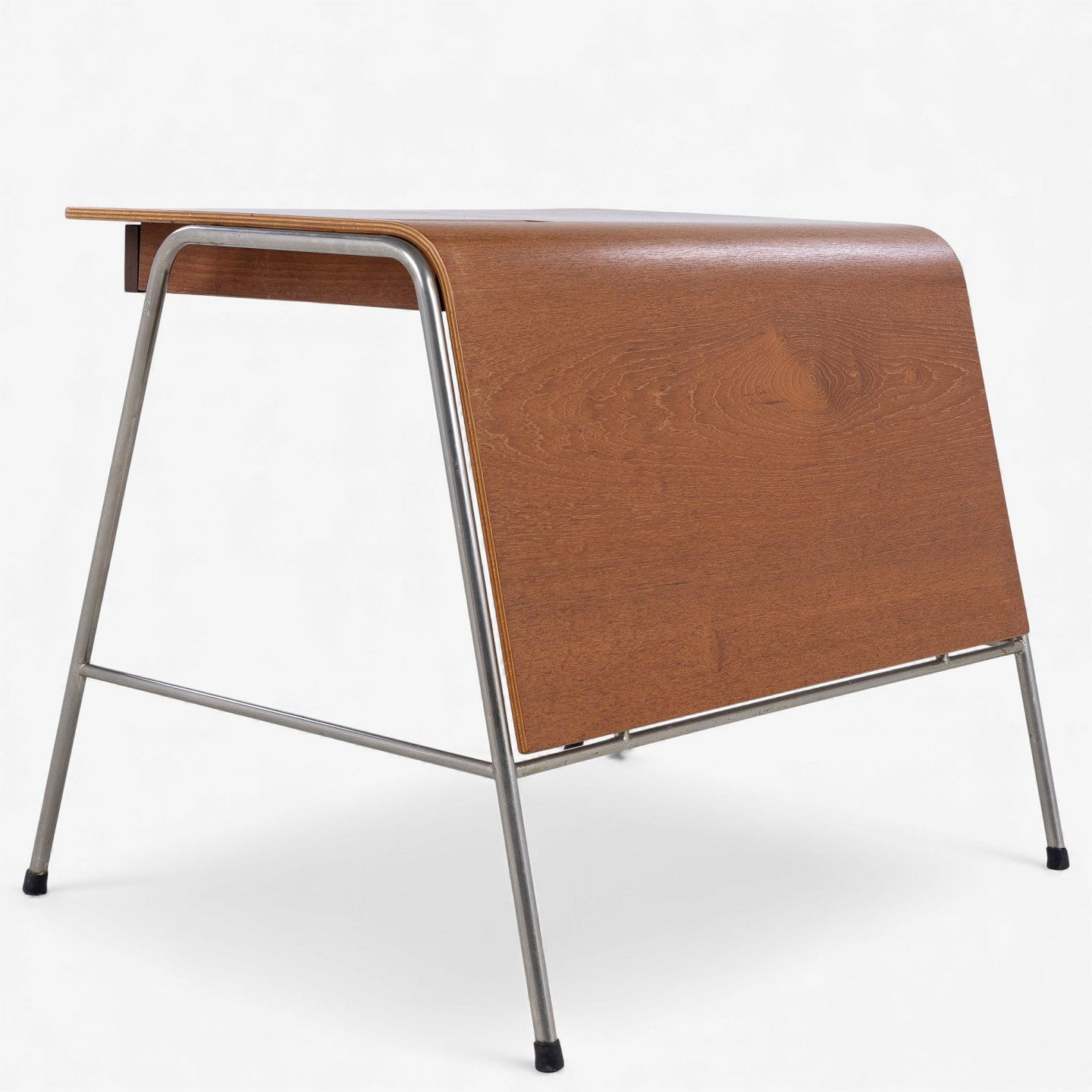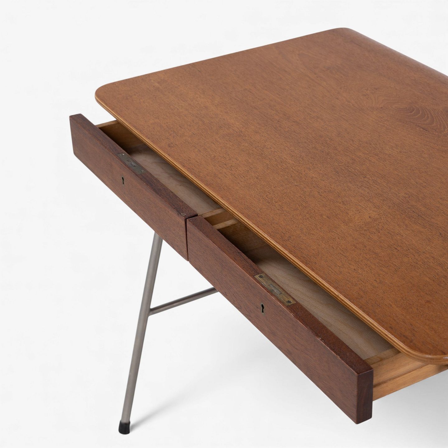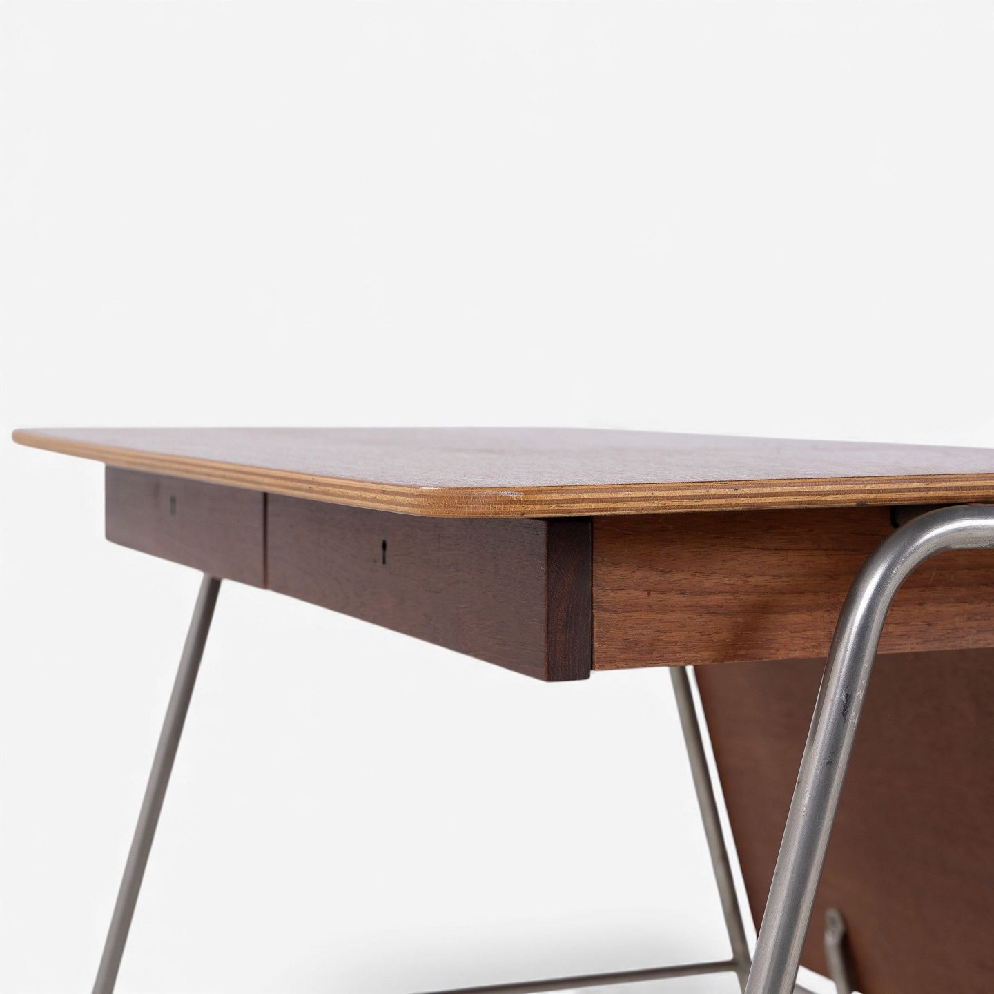 'Munkegaard'-skrivebord/kateder i lamineret teak med to skuffer og stel i stål. Formgivet i 1955 til Munkegaardsskolen.