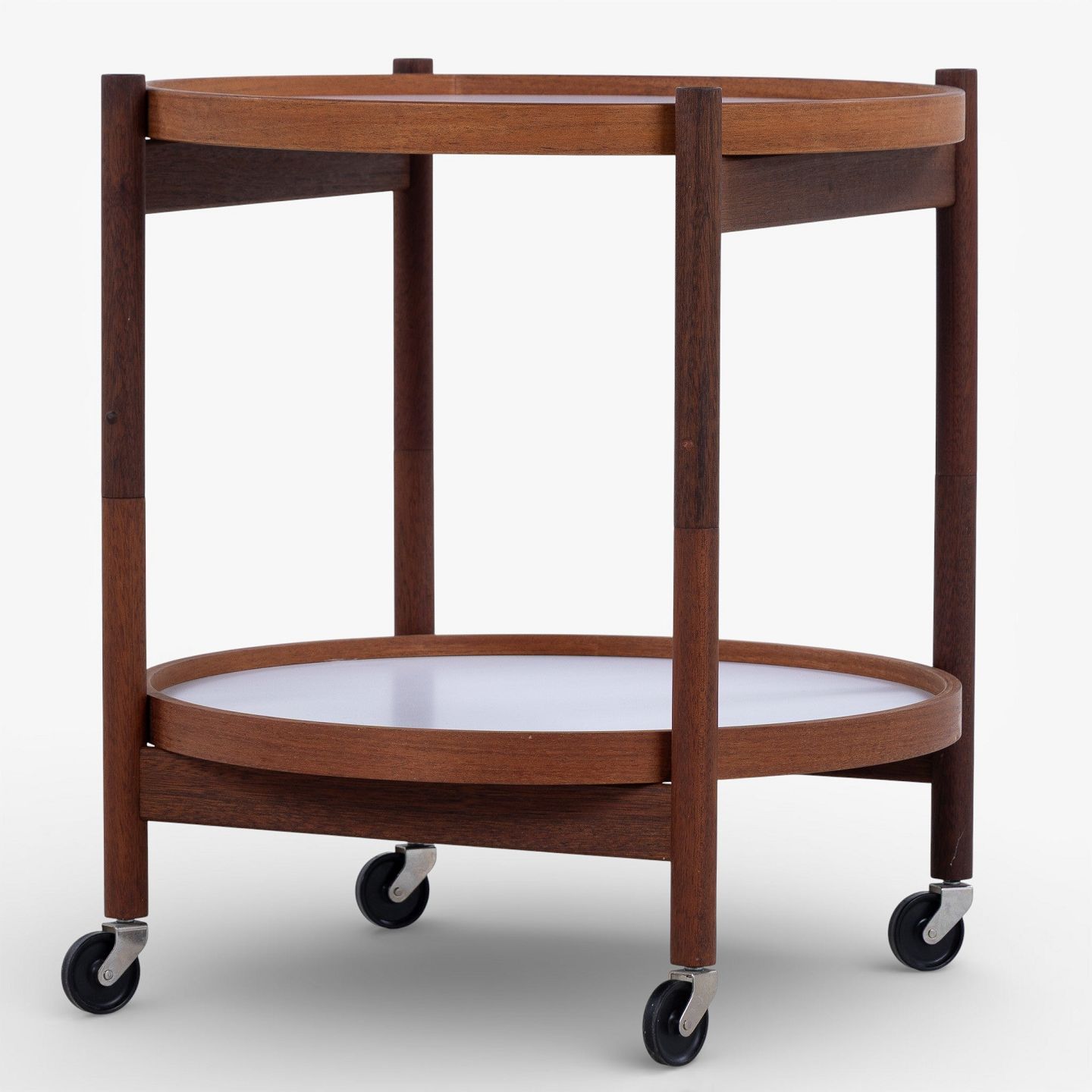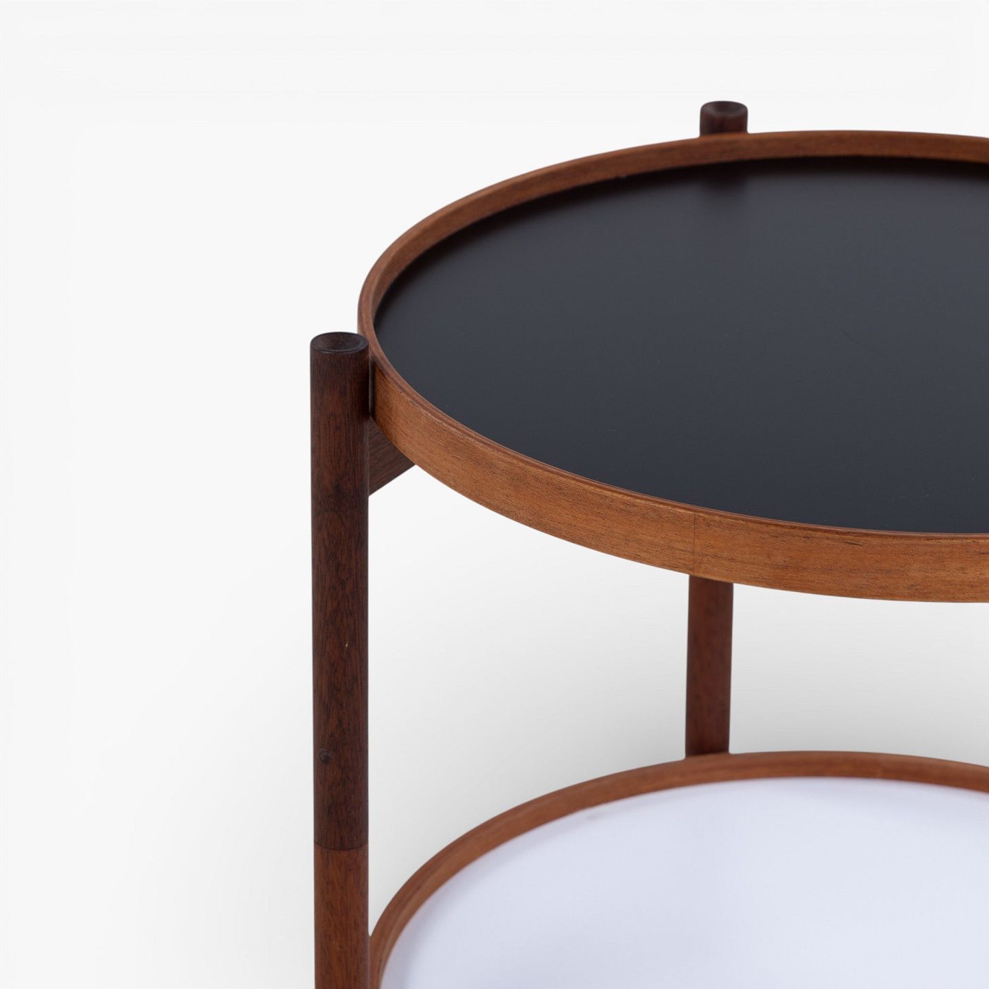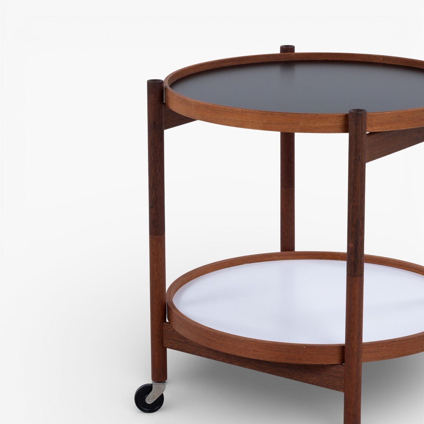 Bakkebord i teak med to vendbare bakker i sort og hvid formica. Mærket fra producent.