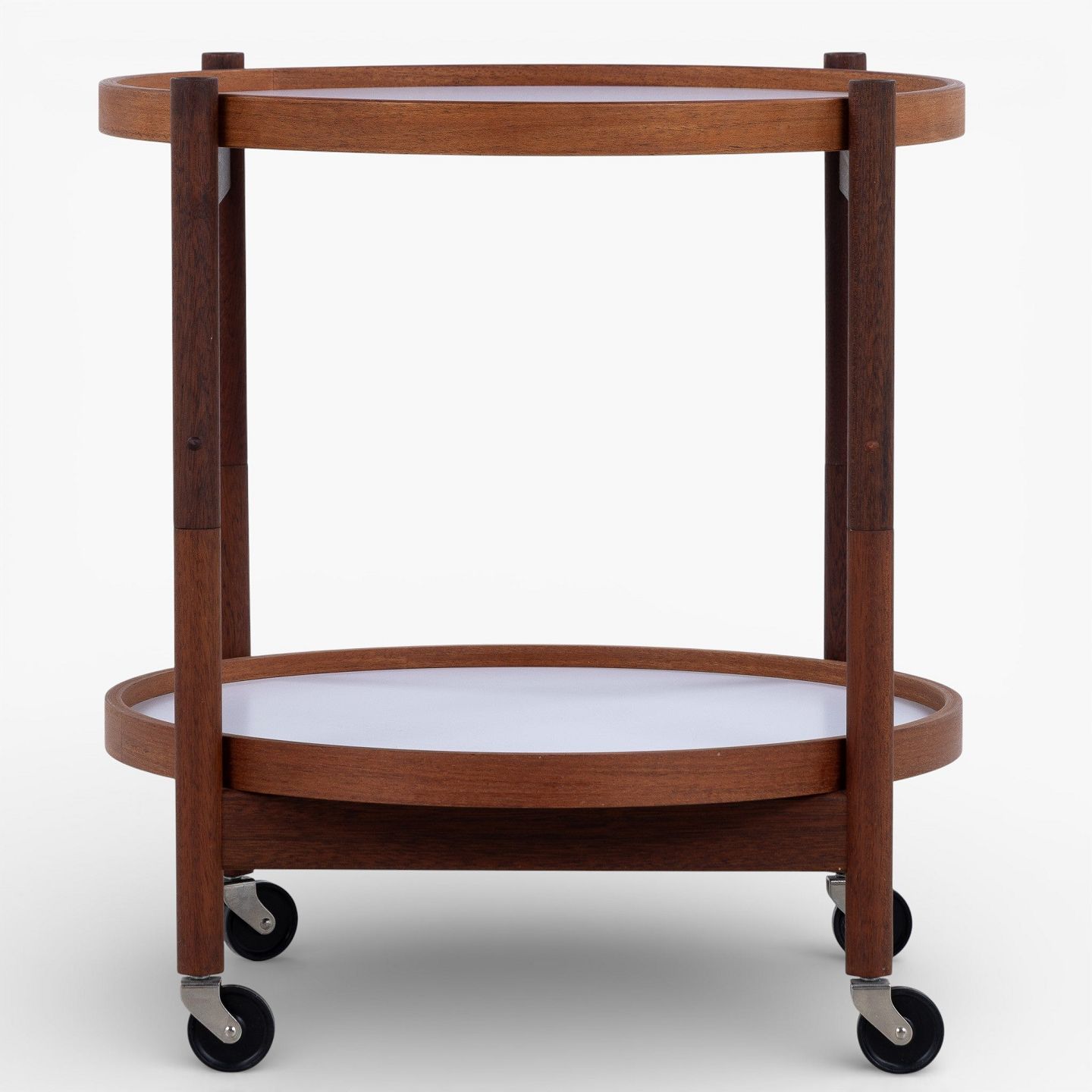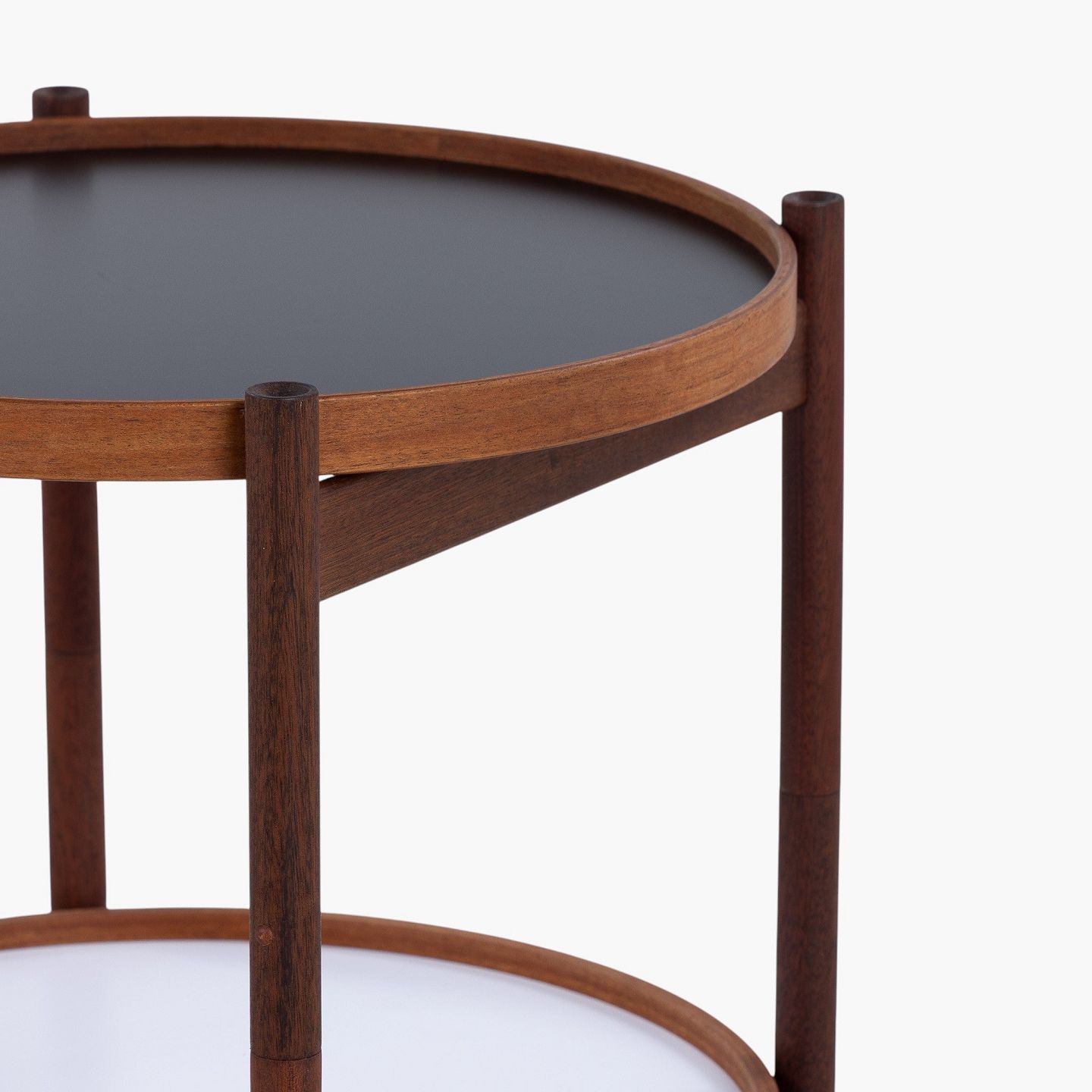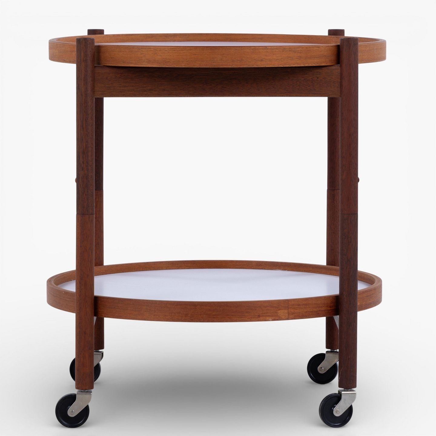 Bakkebord i teak med to vendbare bakker i sort og hvid formica. Mærket fra producent.