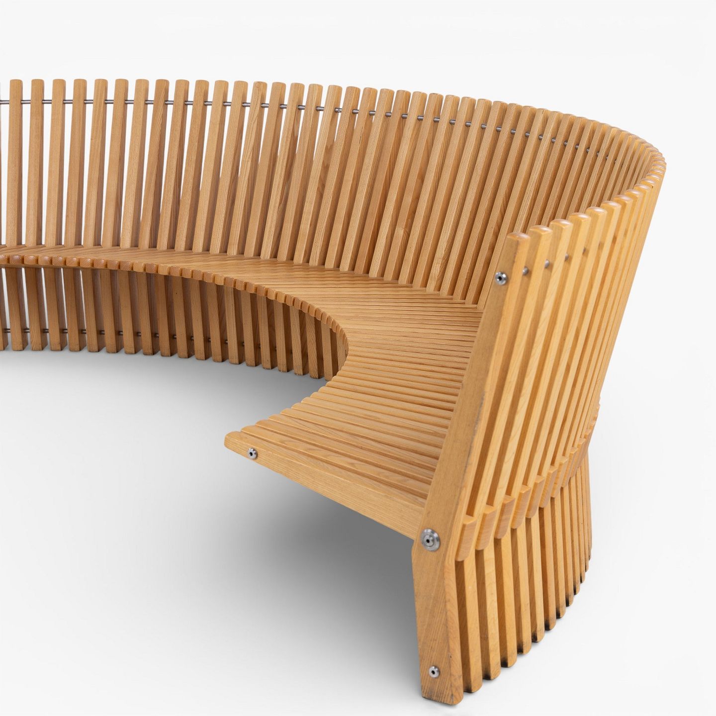 'Astral'-bænk i massiv patineret elmetræ i form af en halvcirkel. Formgivet i 1979.