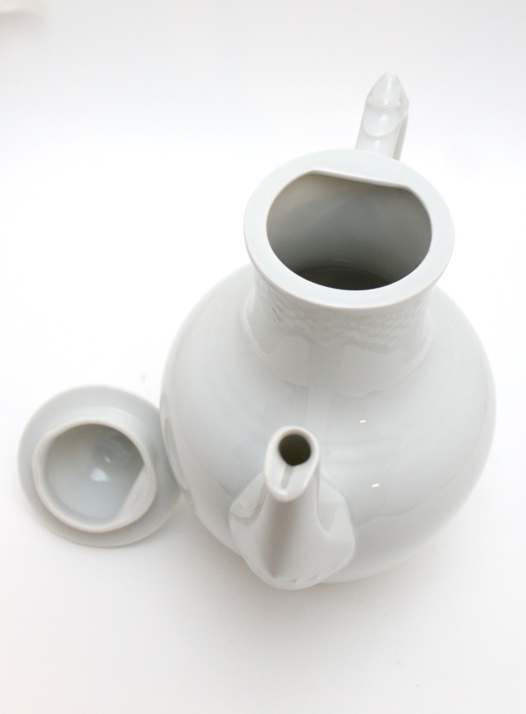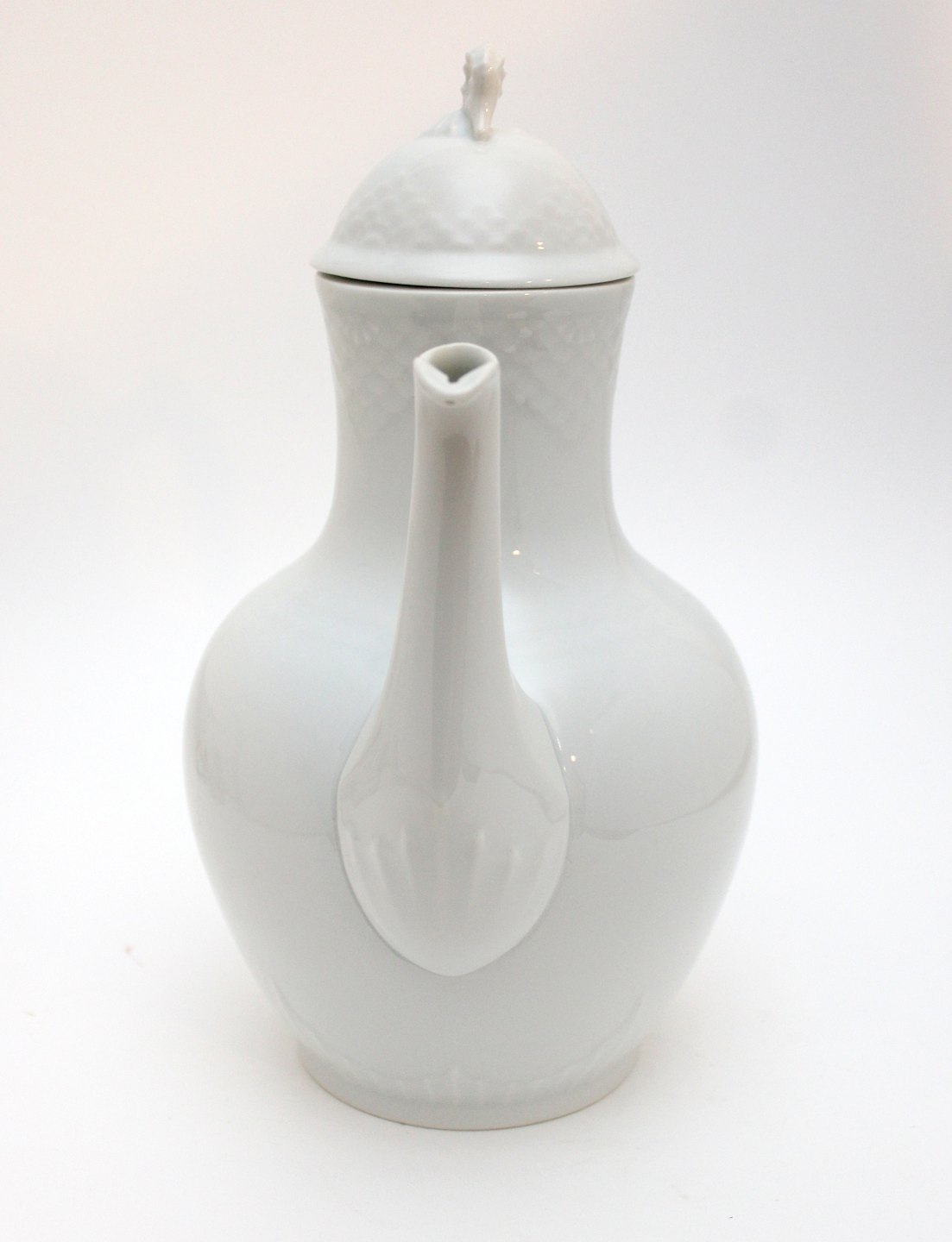 Bing & Grøndahl, Elegance. Kaffekande med låg. Hvidt grundstel med vaflet mønster og søheste. Nr. 91A. Produceret i perioden 1962-1970. Højde 25 cm. Største diameter 12 cm. II. sortering. Fin stand. Pris: 225 kr. stk. Lager: 1