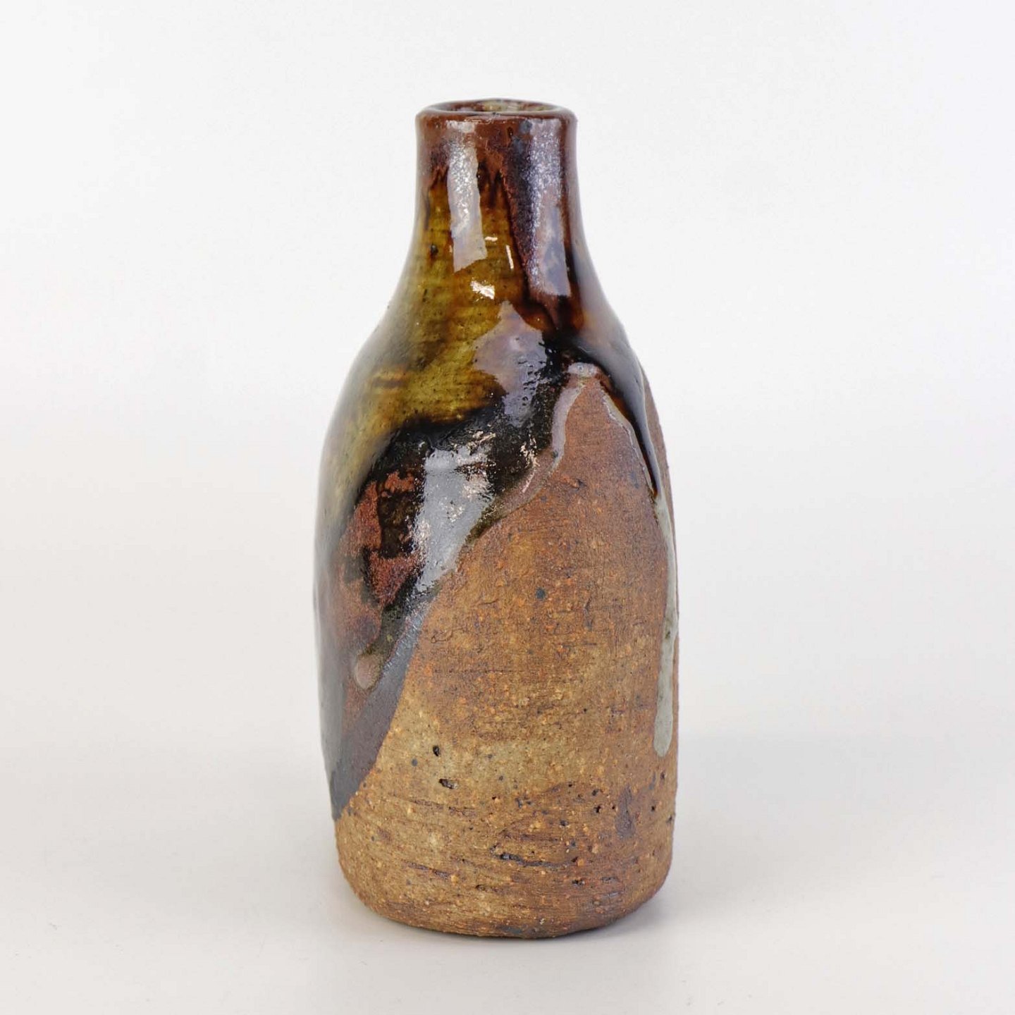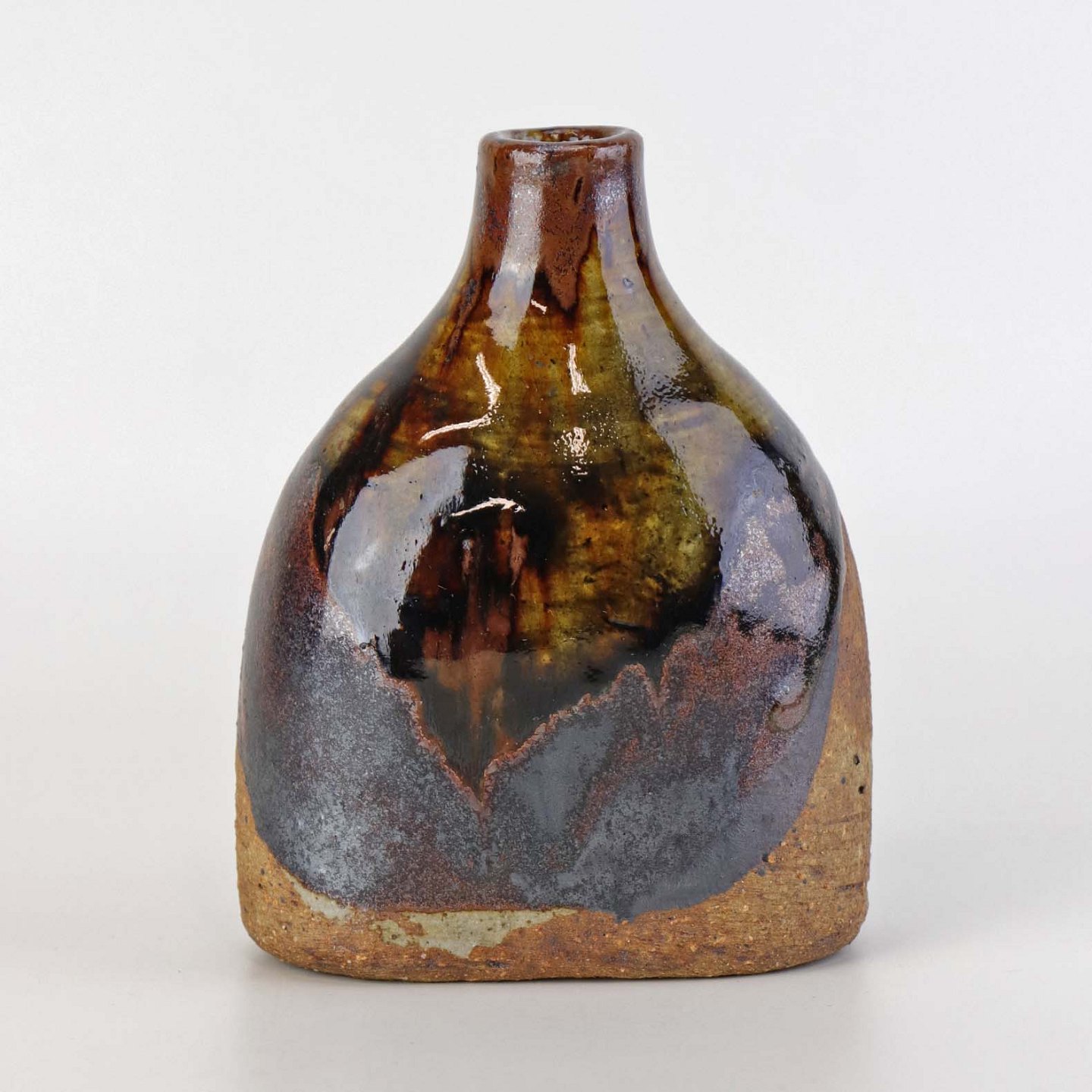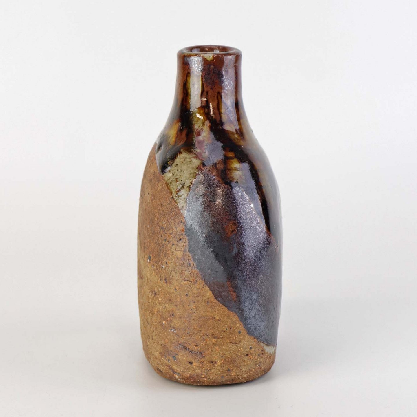 Lille flaskeformet vase i keramik med flerfarvet glansfuld og mat glasur.