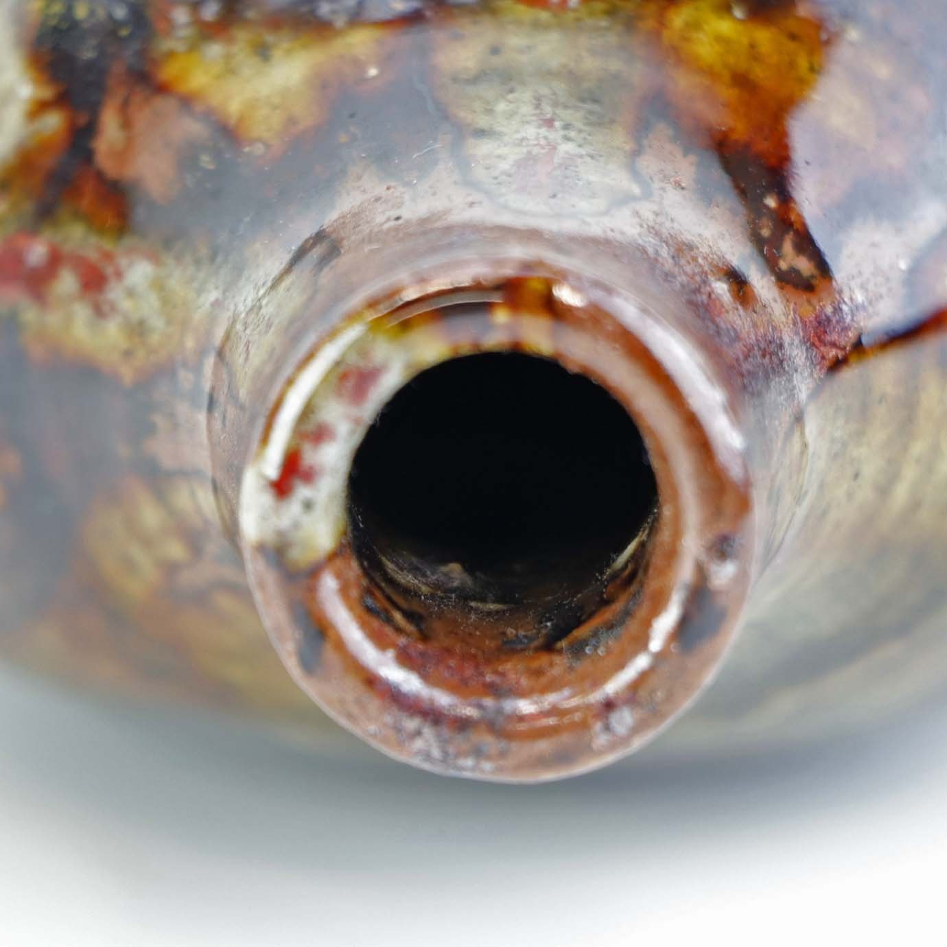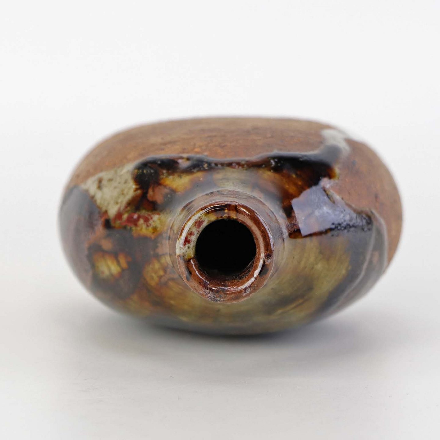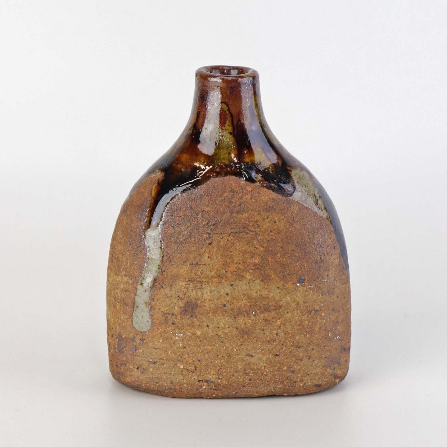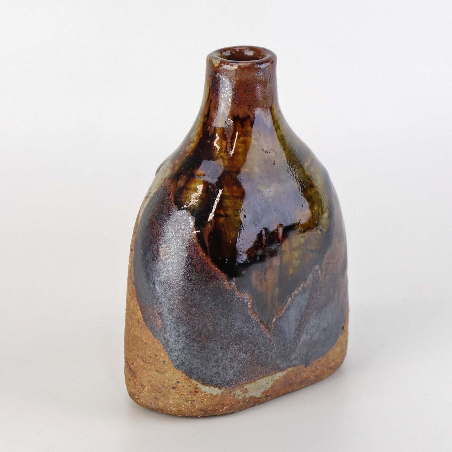 Lille flaskeformet vase i keramik med flerfarvet glansfuld og mat glasur.
