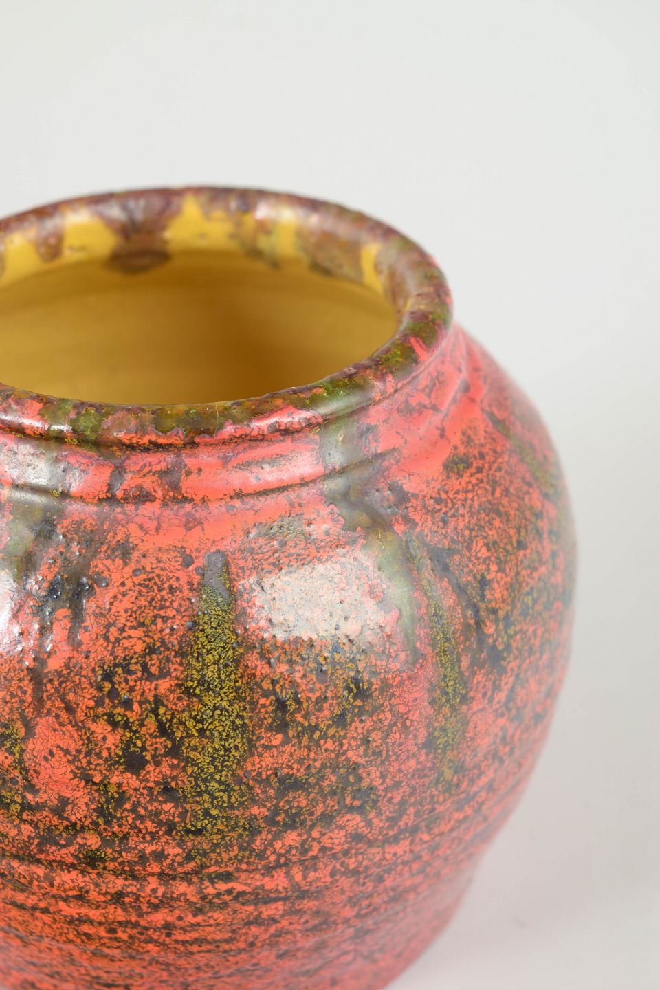 Kompakt og harmonisk vase udført i stentøj med kraftig, levende glasur i varme rød-orange nuancer med mørkere og grønlige variationer. Den afrundede form og den let indadbøjede munding giver et solidt og balanceret udtryk.