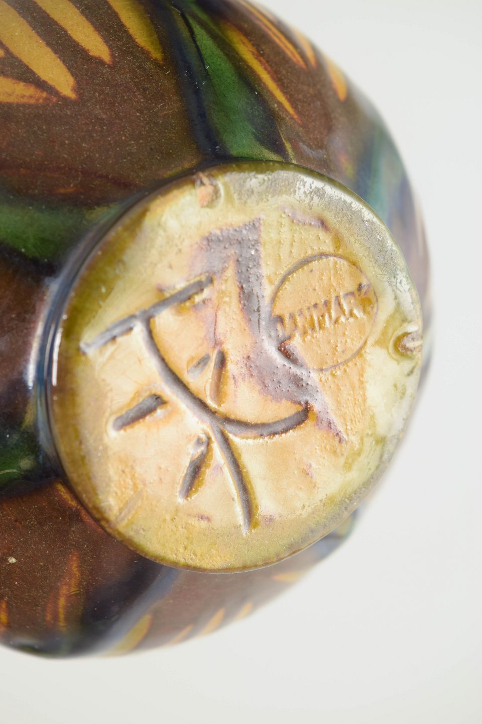 Kählers stentøjsproduktion i 1930’erne er kendt for sine eksperimenterende glasurteknikker og dekorative overflader. Oksehornsteknikken gav mulighed for at styre glasurens bevægelse direkte i materialet og resulterede i dynamiske, næsten flammende mønstre. Mindre vaser som denne forener teknisk kunnen med et stærkt visuelt udtryk og er karakteristiske for periodens keramiske formsprog.
