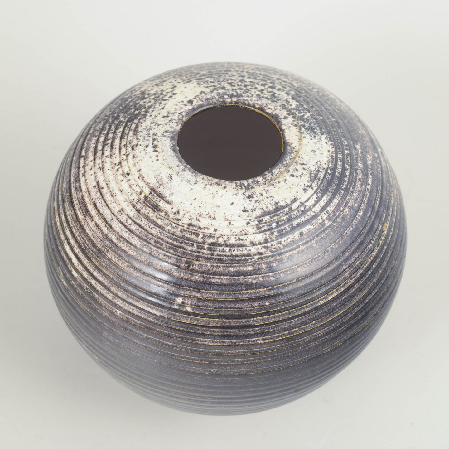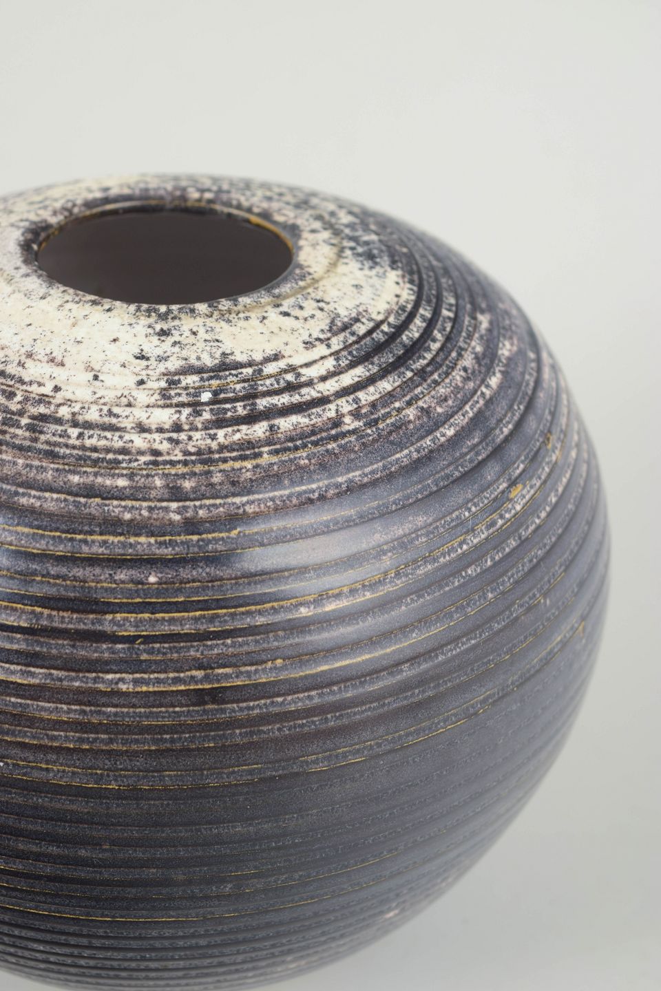 Spherical thrown stoneware vase with a characteristic ribbed surface and a double glaze in black and grey tones, creating a subtle depth and nuanced surface play.
