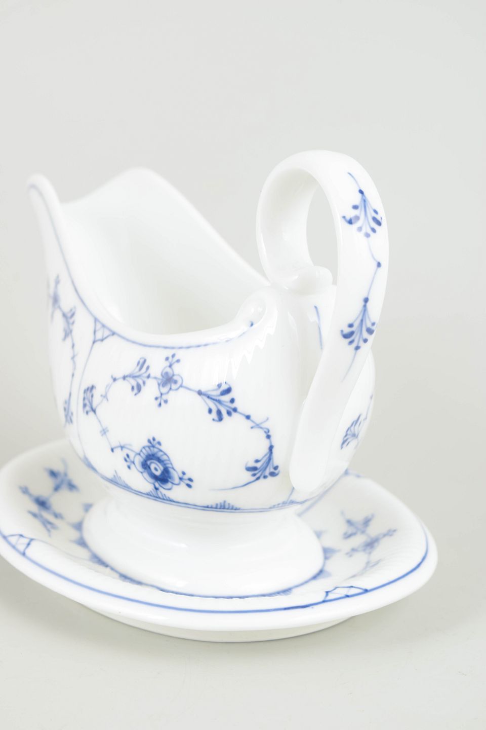 Blue Fluted Plain is Royal Copenhagen’s oldest pattern, introduced in 1775. The ribbed form combined with hand-painted underglaze decoration has for generations been a hallmark of Danish porcelain craftsmanship. Sauce boats of this type formed a natural part of the formal dining table around 1900 and exemplify the service’s functional elegance and timeless character.