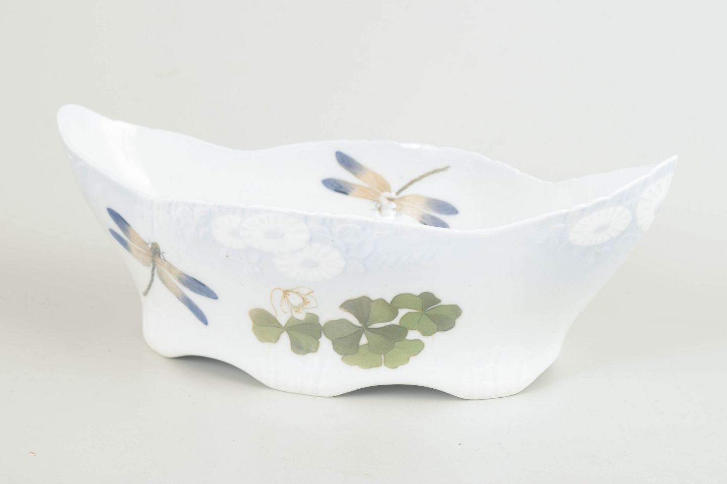 Blødt formet jardiniere i porcelæn udført i Art Nouveau-stil med organisk, bølgende kontur og håndmalet dekoration med sommerfugle og bladmotive. Et dekorativt plantekar fra begyndelsen af 1900-tallet, karakteristisk for periodens naturinspirerede formsprog.