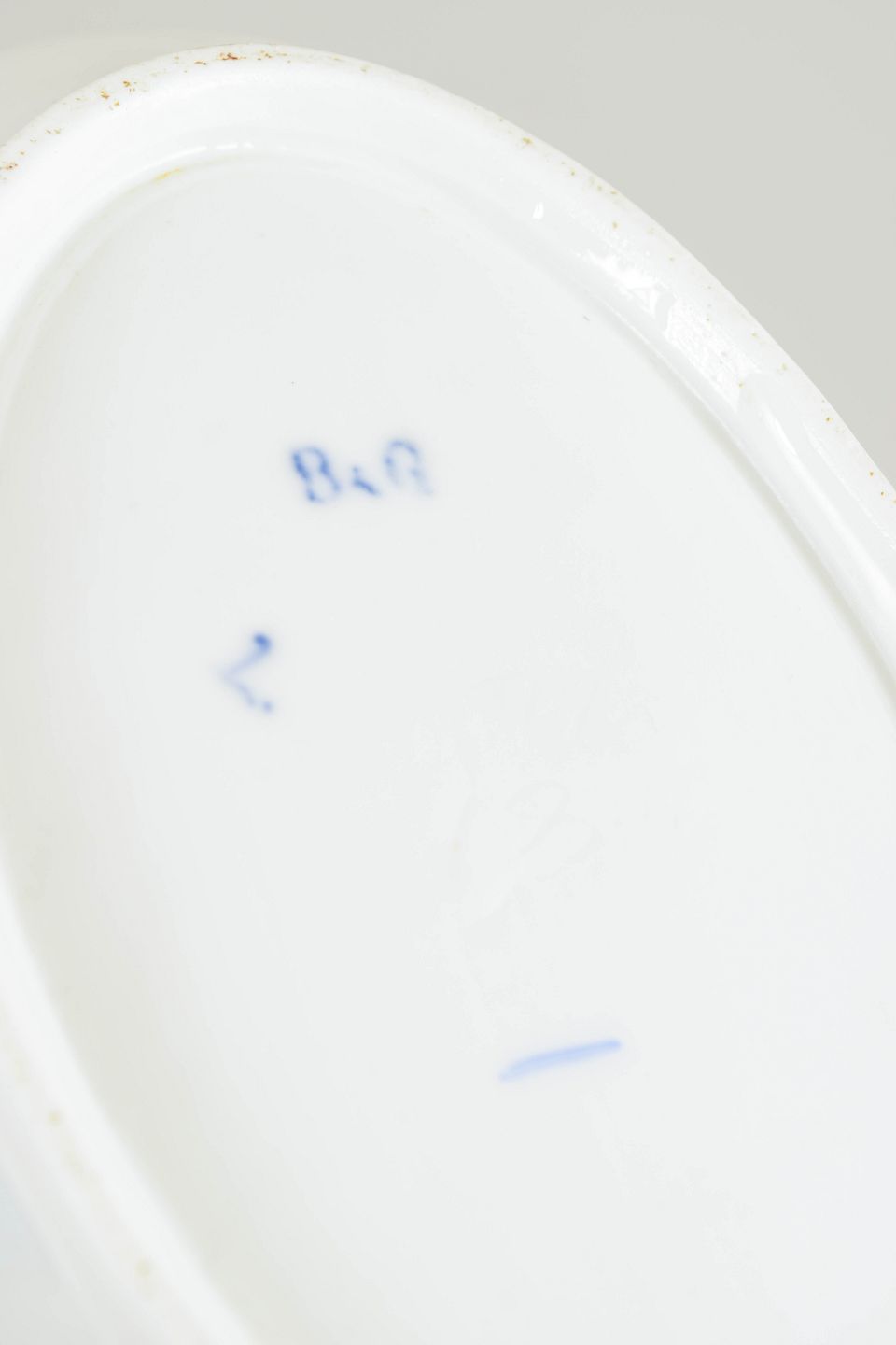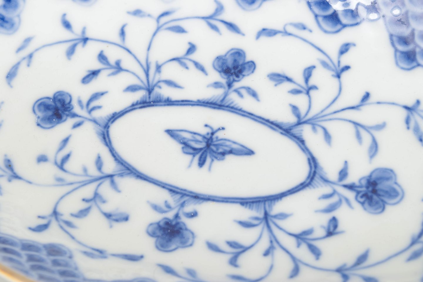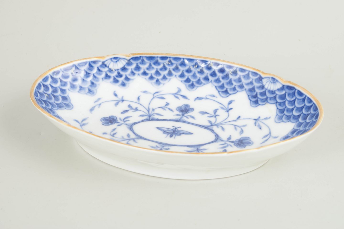Antikt ovalt porcelænsfad dekoreret med blå underglasur i det klassiske Sommerfugl-mønster. Dekorationen er opbygget omkring en central medaljon med sommerfugl og florale ranker, omgivet af en karakteristisk skællet rand og afsluttet med håndpålagt guldkant.