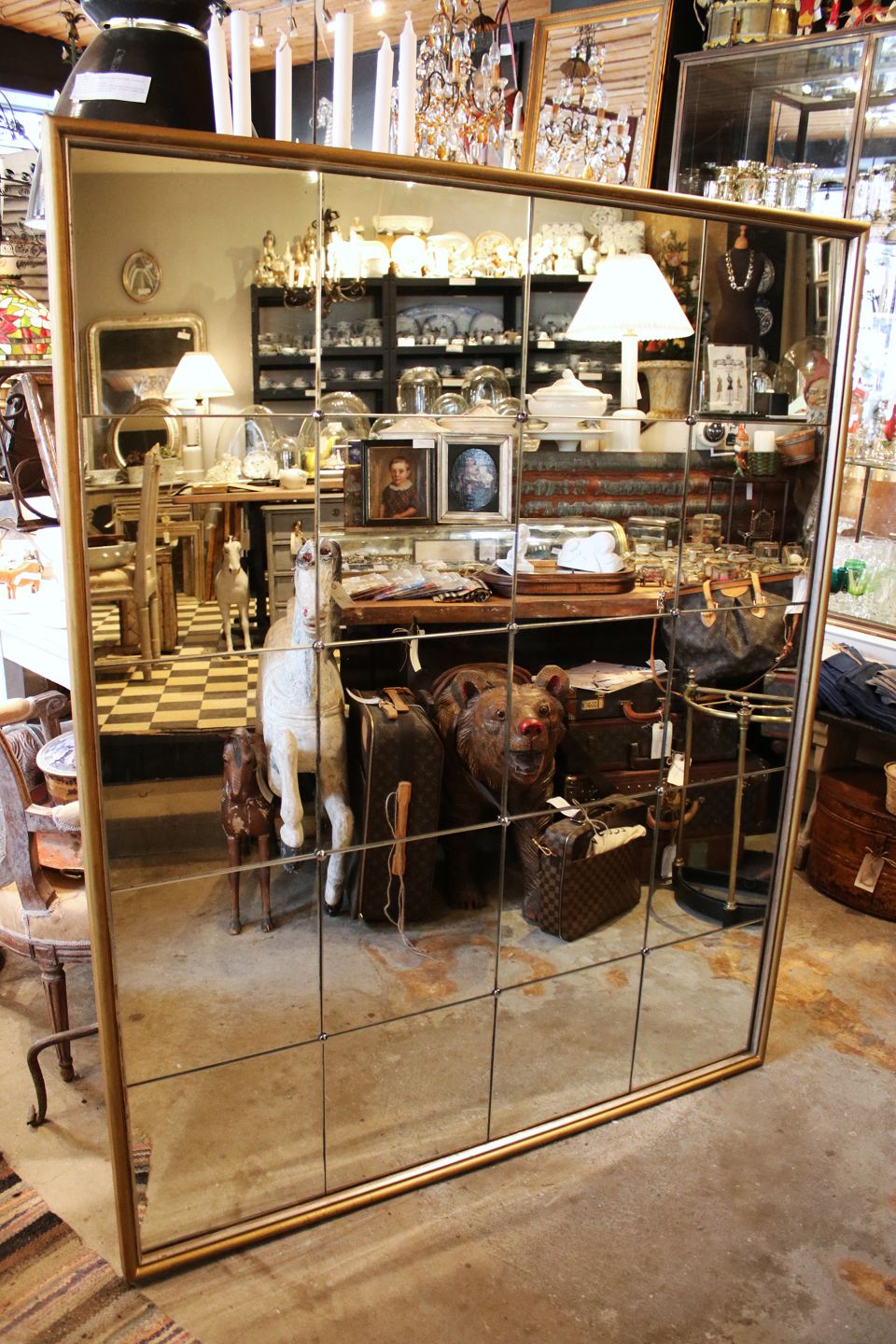 Gammelt fransk "Bistro" spejl med 20 stk. spejlglas med fin patina i spejlglasset og indrammet i bred forgyldt træ ramme med smal sølvkant. Måler H: 160cm. B: 129cm.
