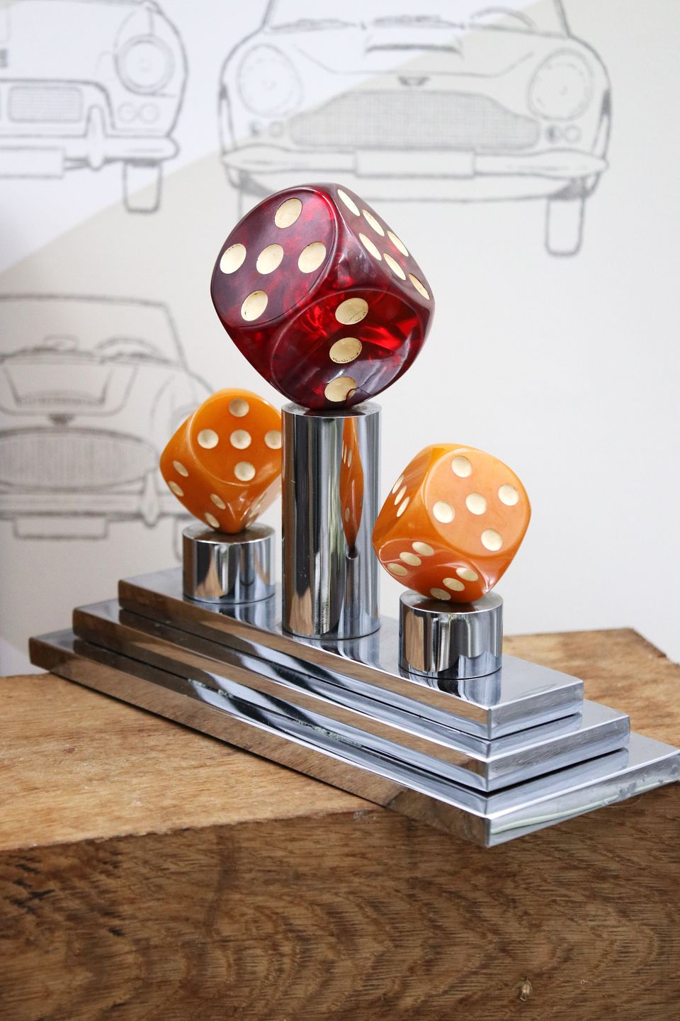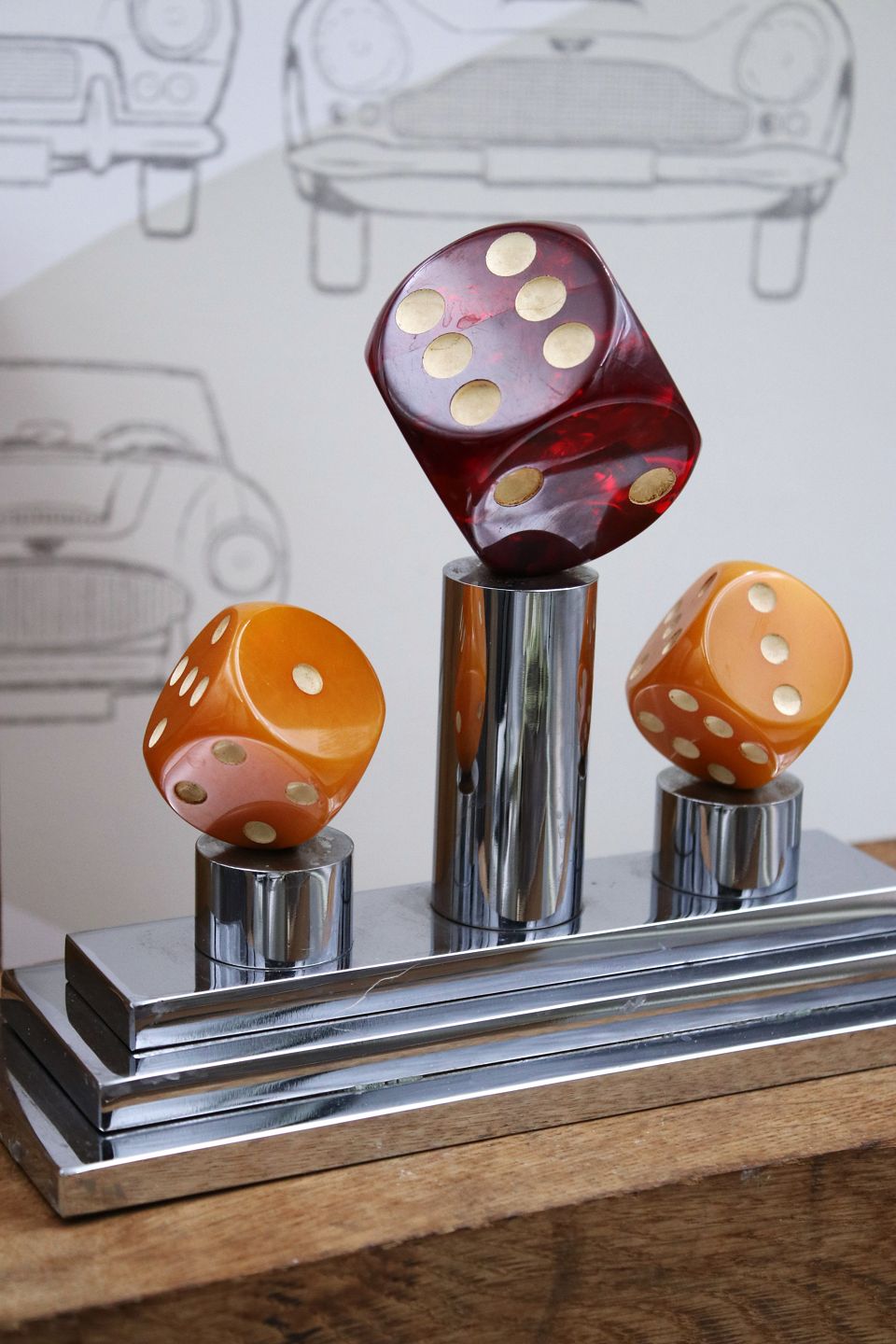Decorative, old game trophy in chrome with 3 large dice in colored acrylic...