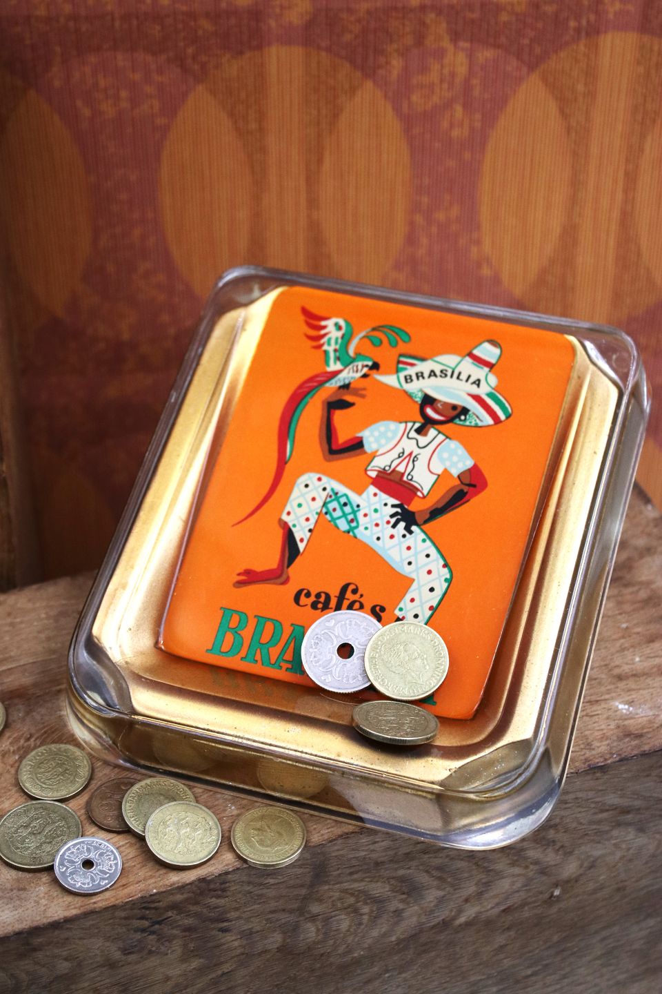 Gammelt penge fad fra kaffebar i 50/60erne i kraftigt glas med motiv af brasiliansk mand med papegøje...