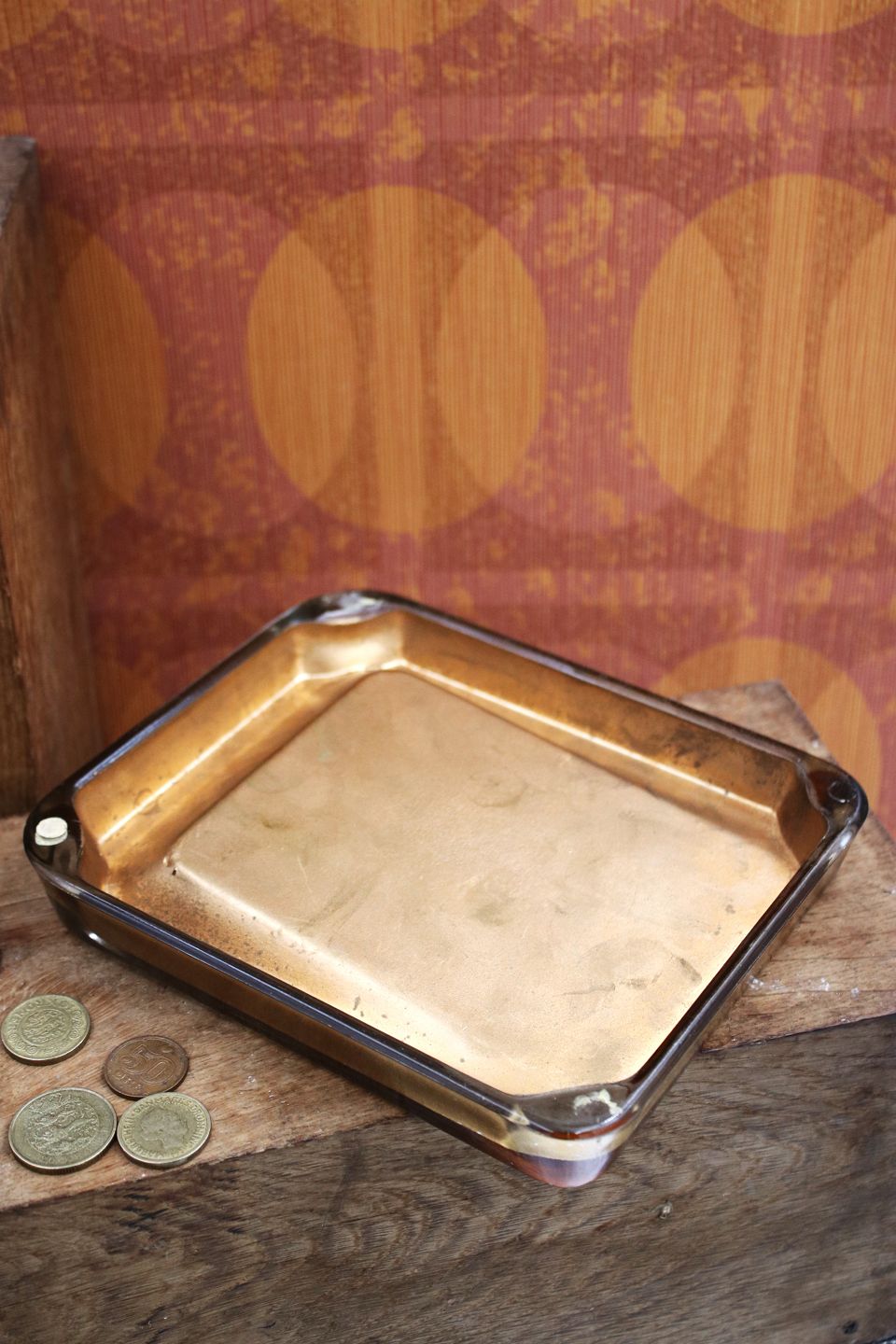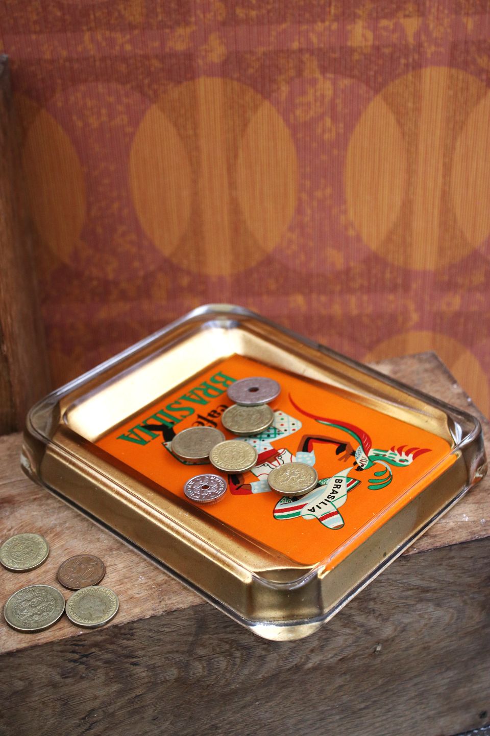 Gammelt penge fad fra kaffebar i 50/60erne i tykt glas med motiv af brasiliansk mand med papegøje. H: 3cm. 19x15,5cm.