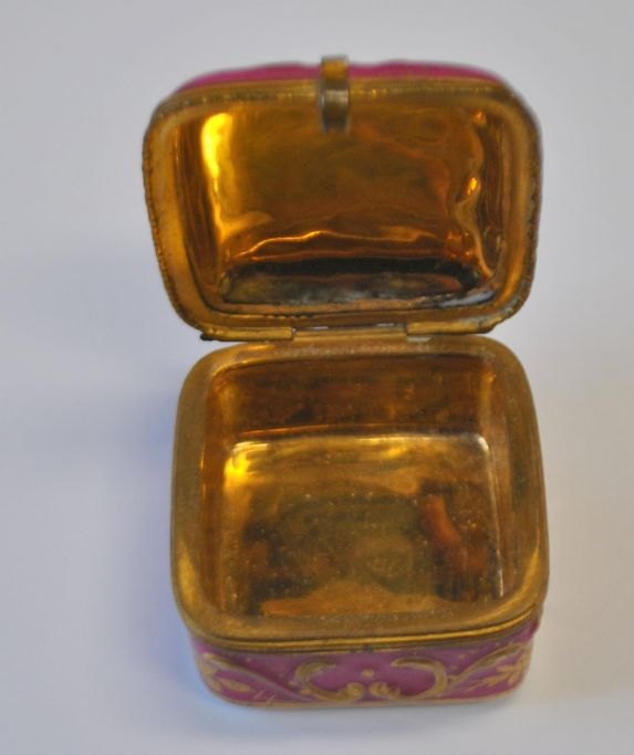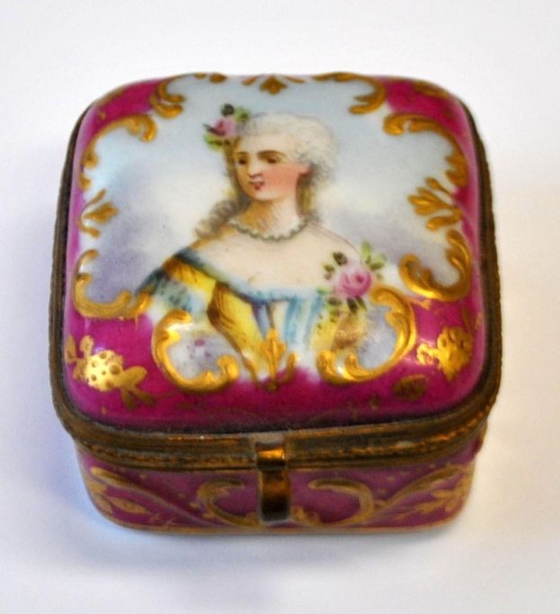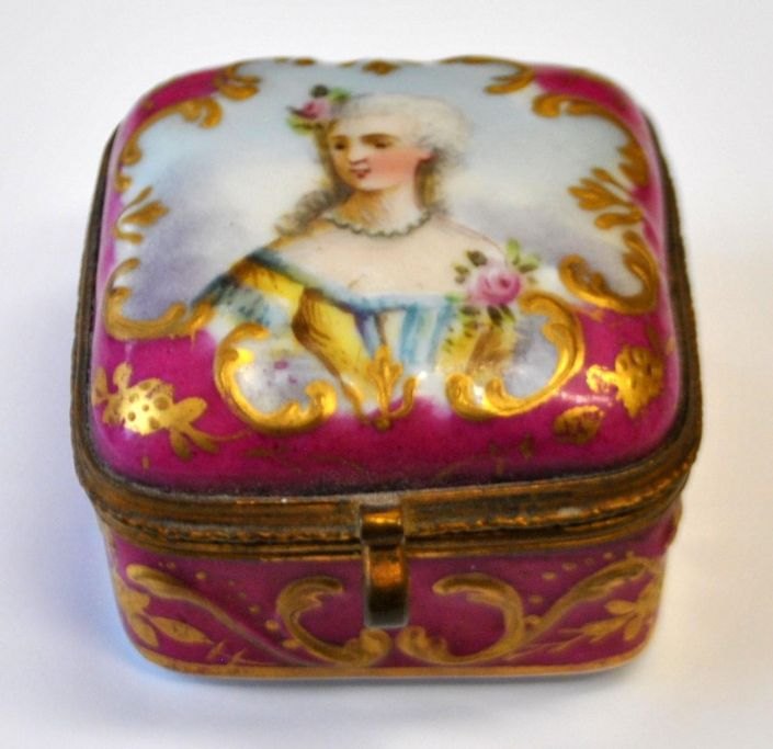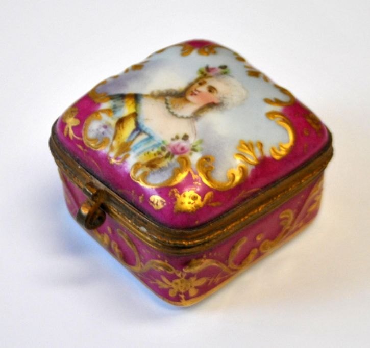 Sevres porcelæns pilleæske, 19. årh. Frankrig. Håndmalet porcelæn med rococo kvinde. Lysrød med rococoforgyldnigner. Indvendig forgyldt. 4,5 x 4,5 x 3 cm. Perfekt stand!