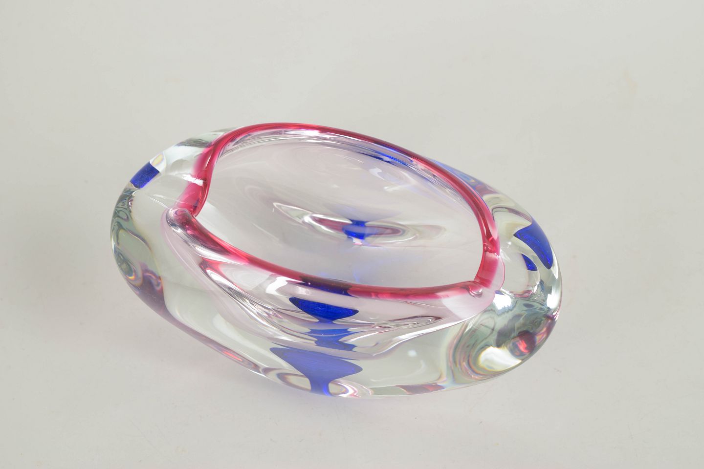 Organisk formet skål i mundblæst kunstglas med lagdelt sommerso-teknik. Klar glasmasse med indkapslede farvefelter i blå og rosa, der skaber dybde og et karakteristisk svævende farvespil. Typisk Murano-arbejde fra 1960’erne/70’erne med bløde, skulpturelle linjer.