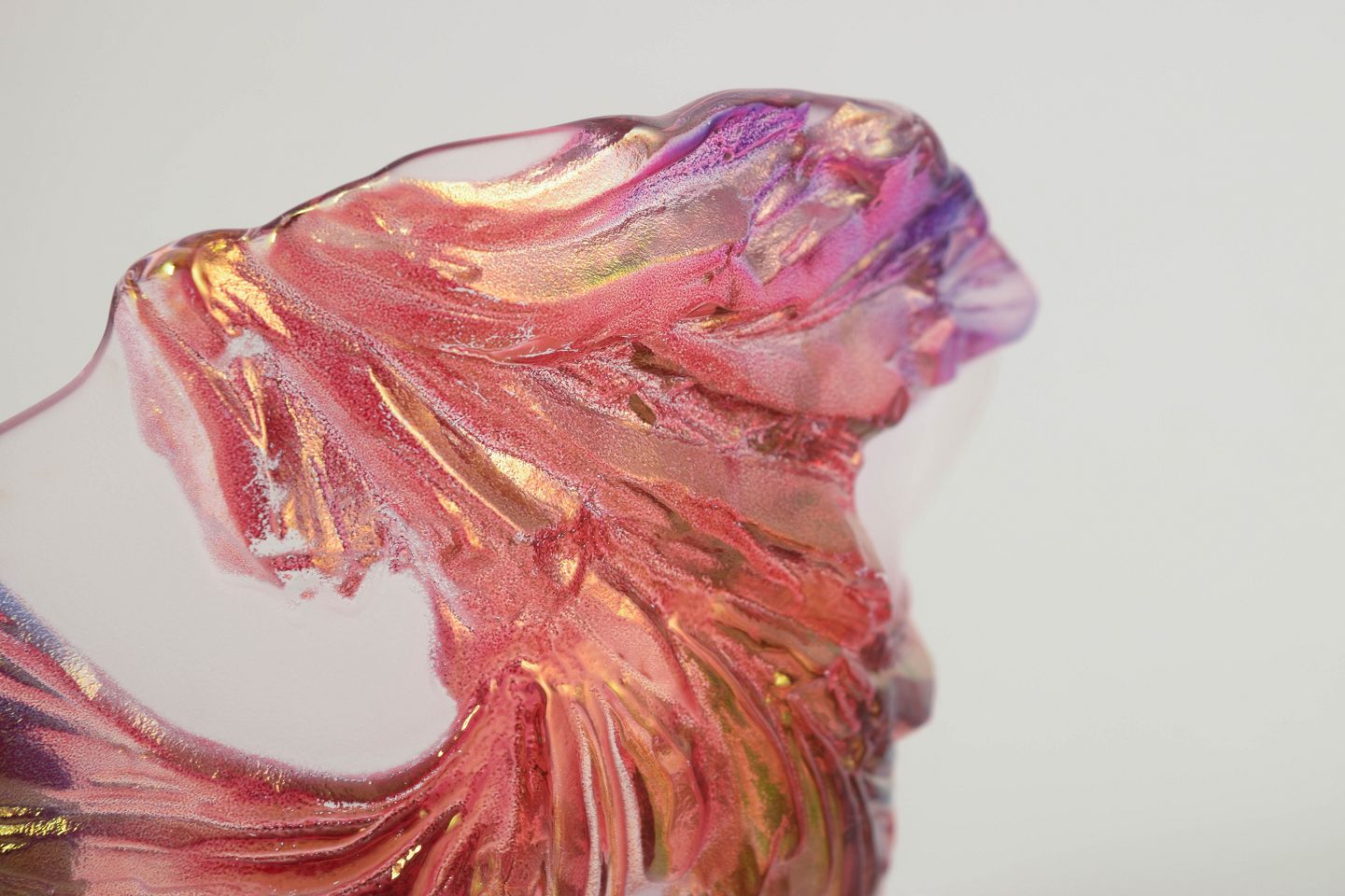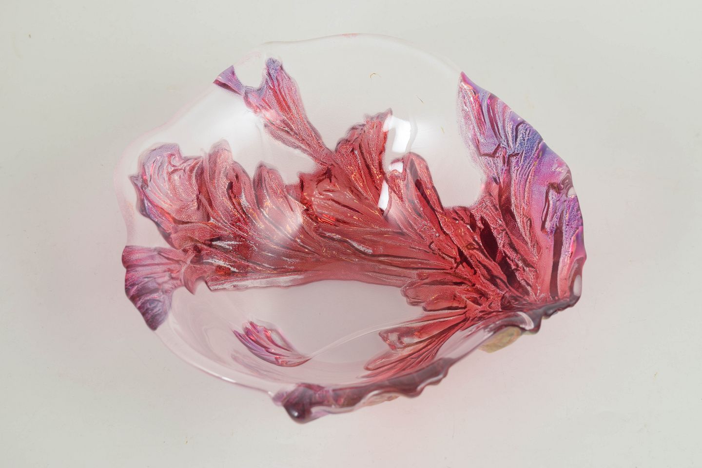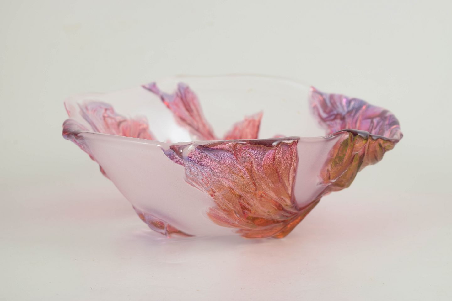 Mundblæst kunstglasskål med organisk, bølgende form og let opadbøjet kant. Dekoreret med pålagte, blad- eller kronbladslignende elementer i rosa, lilla og ravtoner, som giver et levende og skulpturelt udtryk.