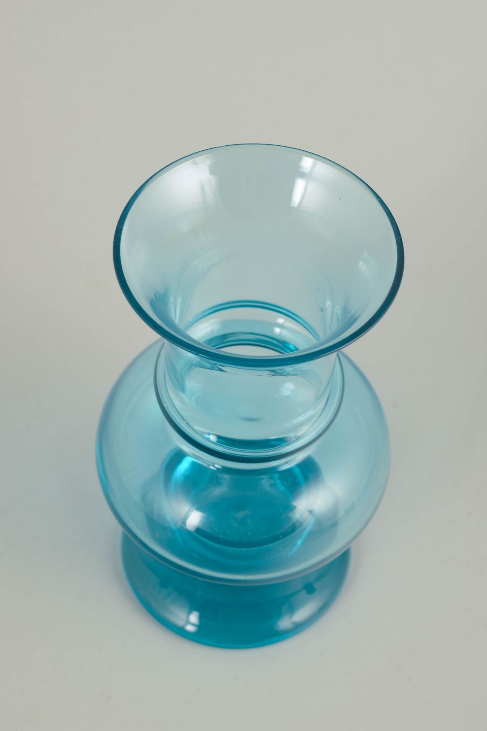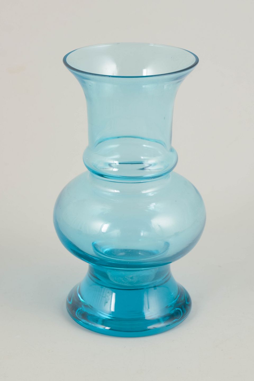 Elegant vase i klart turkisblåt glas med balanceret, skulpturel profil og blød, rundet krop. Mundblæst udførelse med let udadbøjet hals og fod, typisk for finsk kunstglas fra 1970’erne.