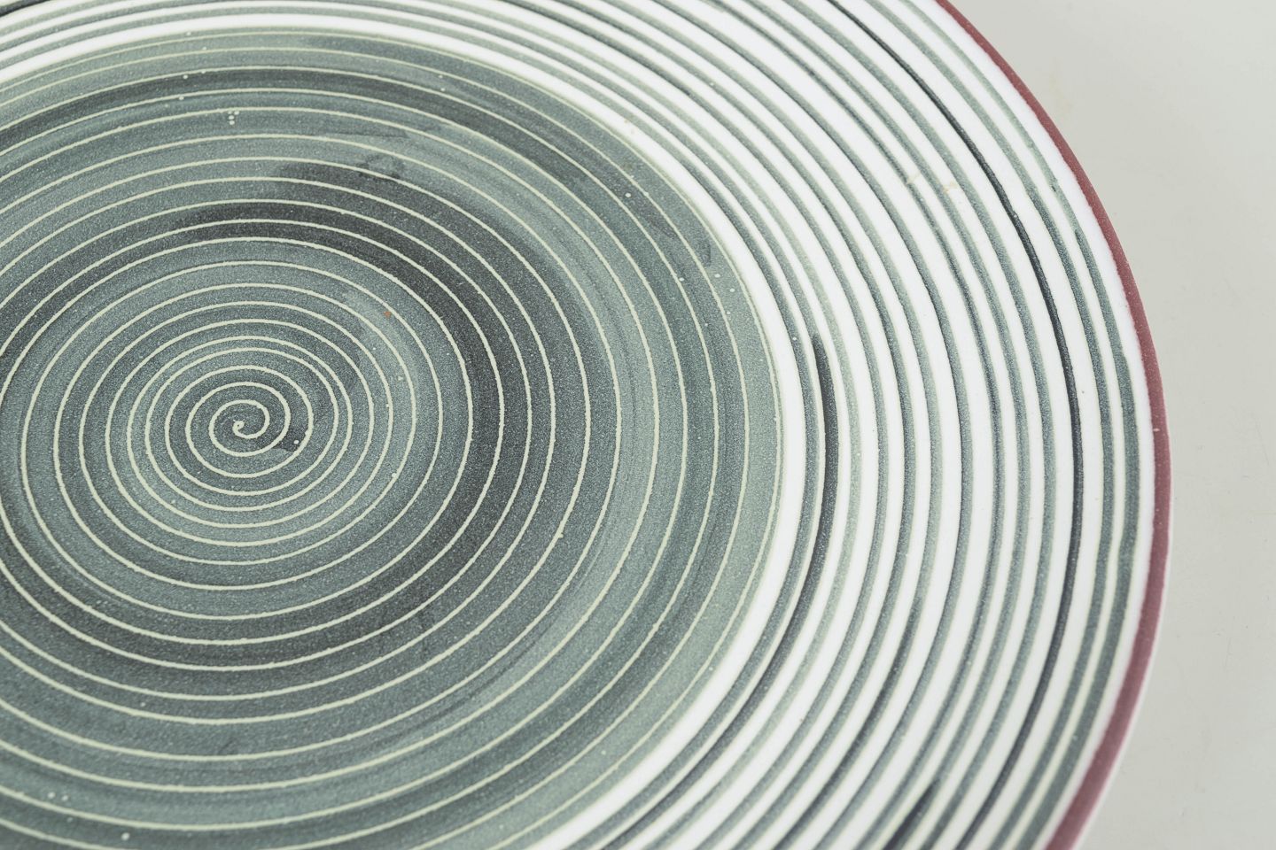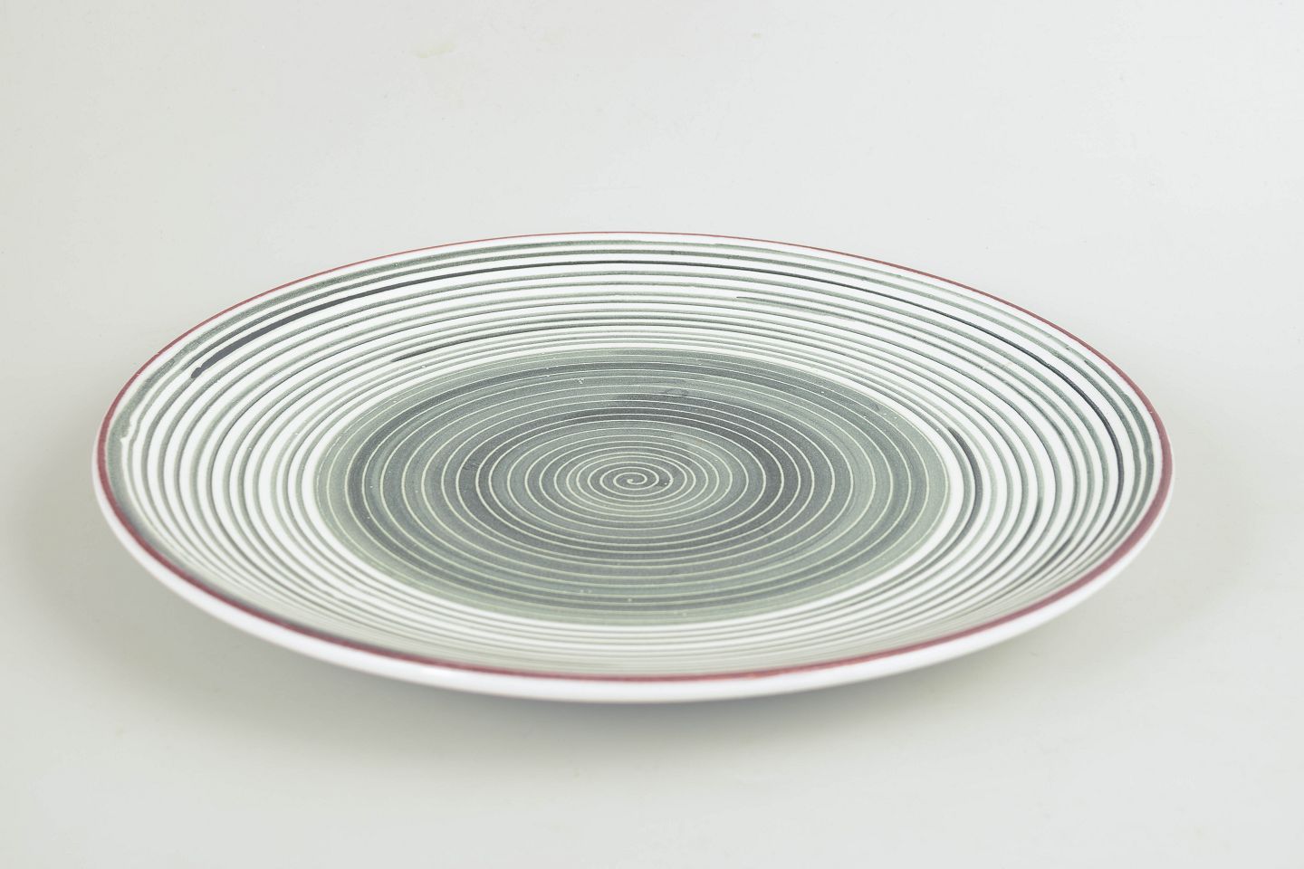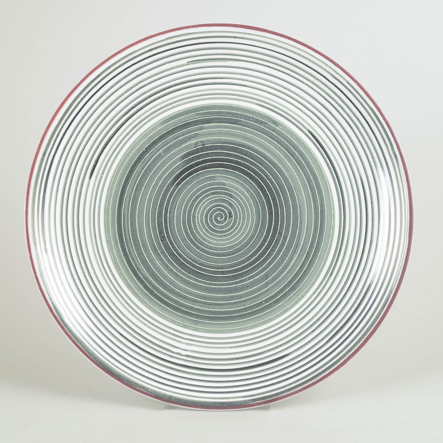 Dekorativt fad i glaseret keramik med grafisk spiralornamentik i grågrønne nuancer og rød kant. Modellen fremstår med et stramt, tidstypisk formsprog fra 1930/40’ernes svenske modernisme og er angivet som model 53.