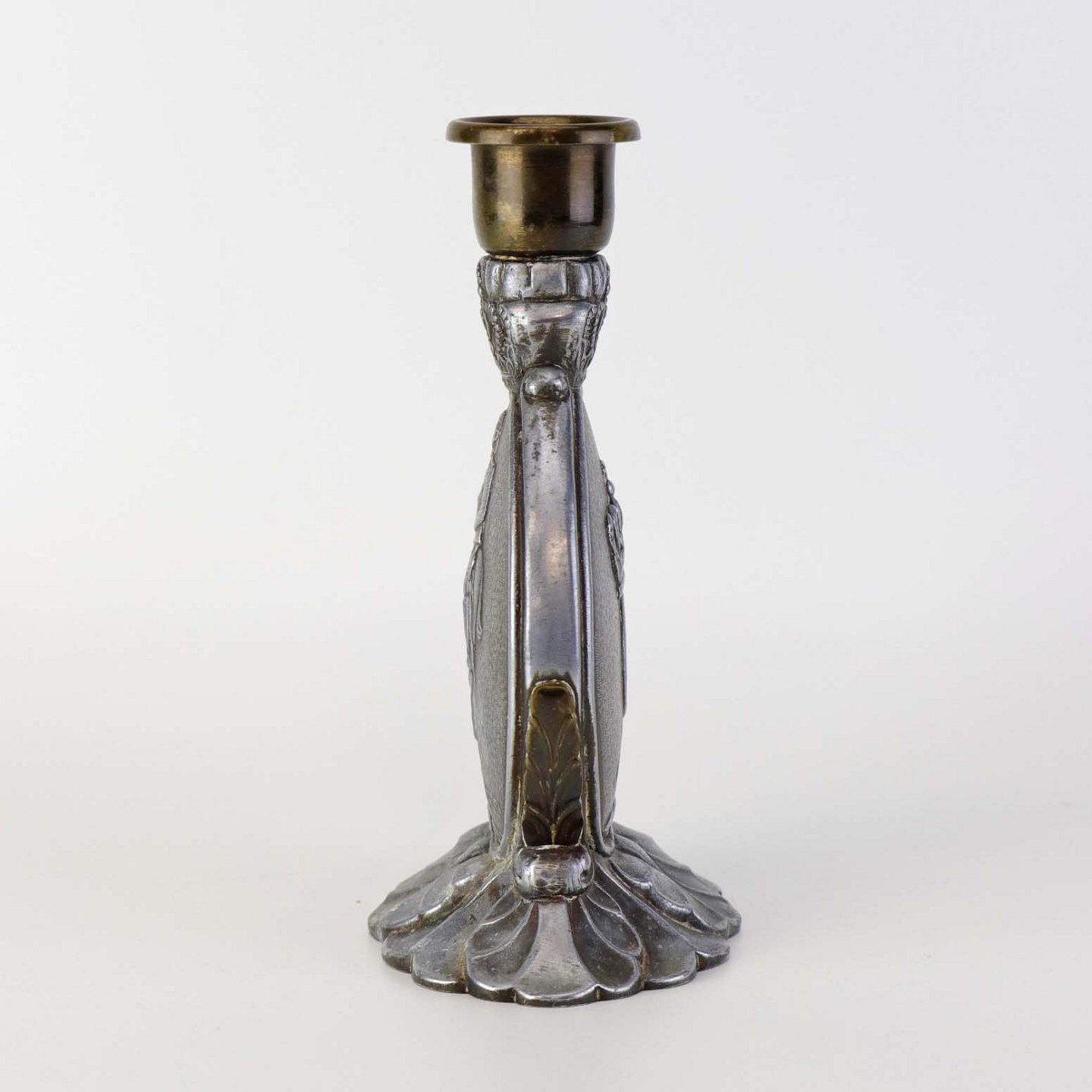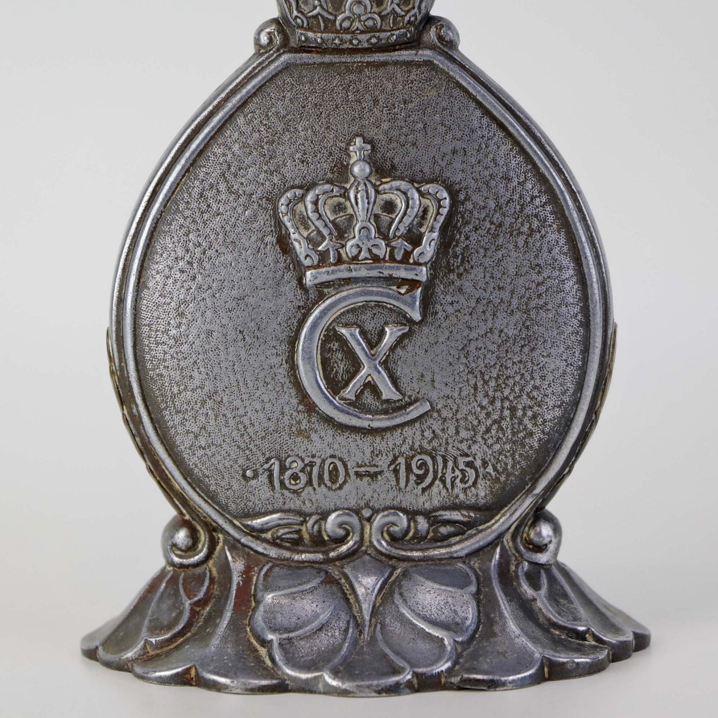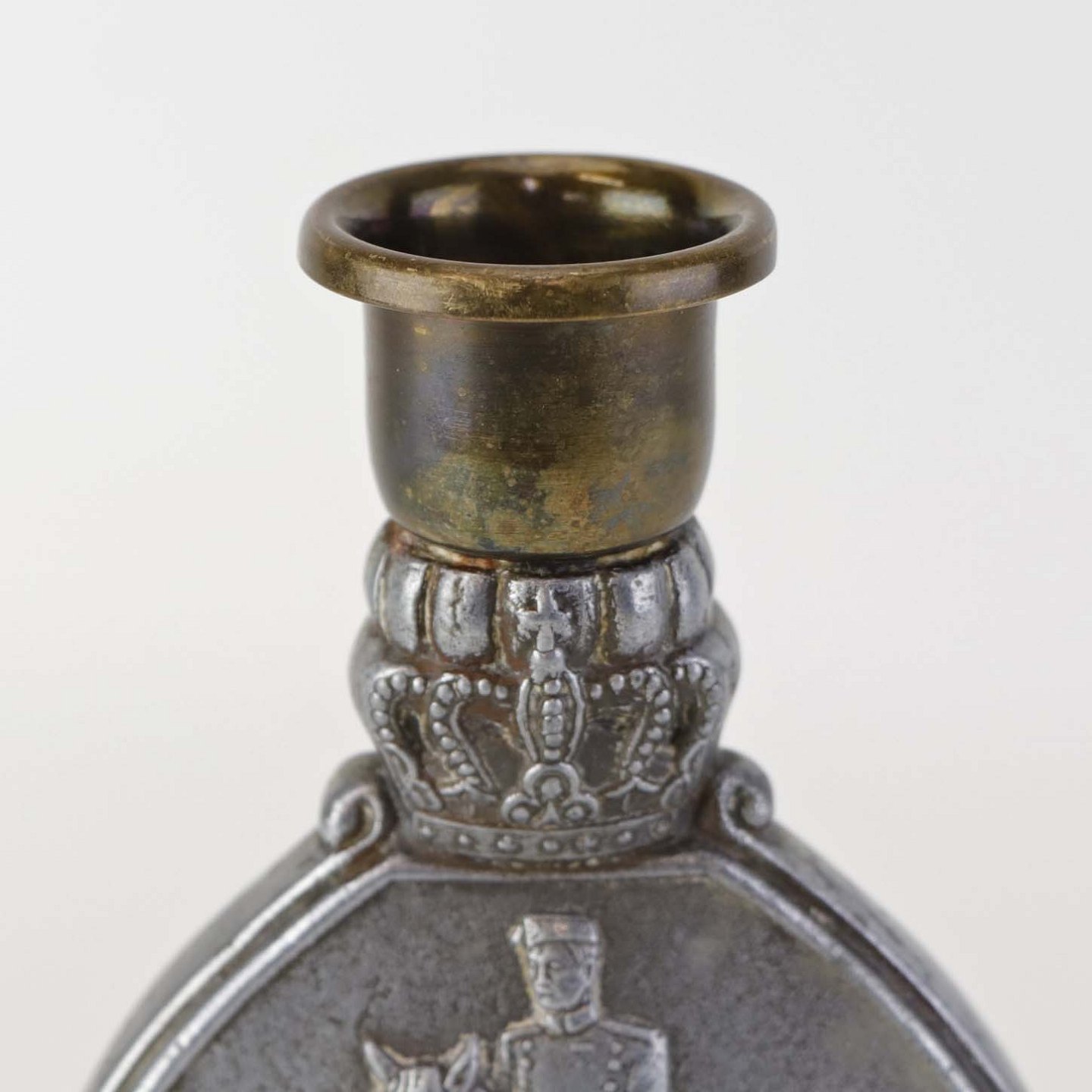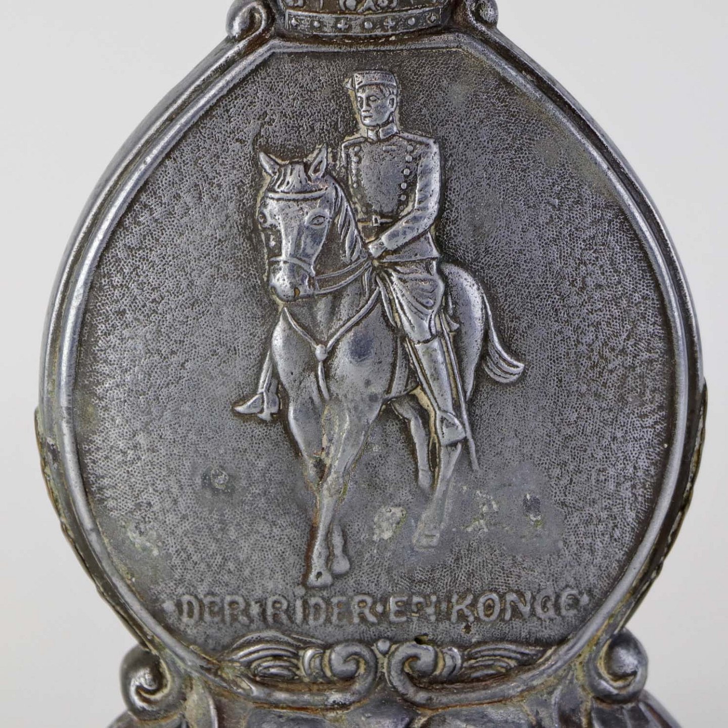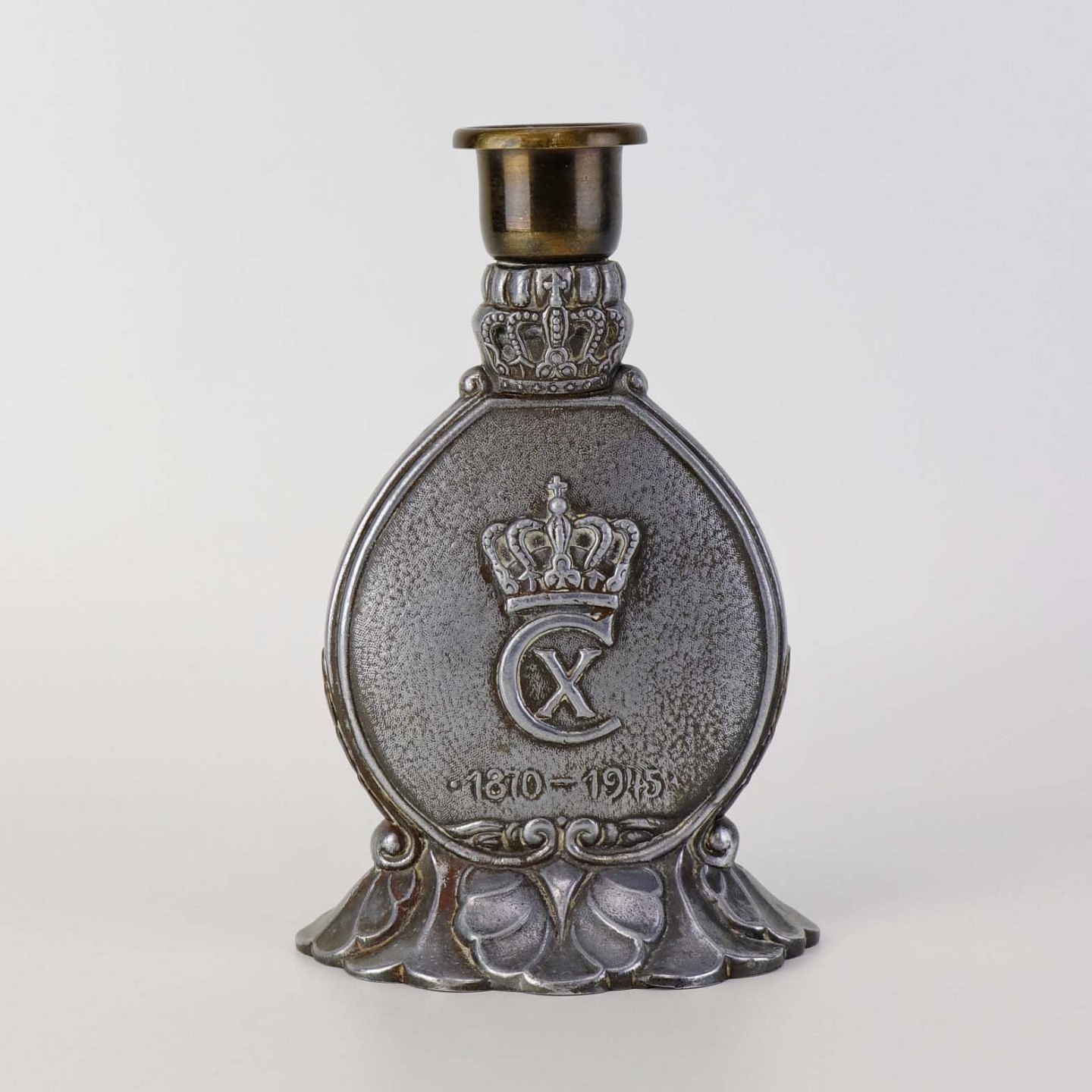 Lysestage i tin med messing dekoration og top med motiv af Kong Christian den 10. til hest med teksten 'Der rider en konge' og '1870-1945'