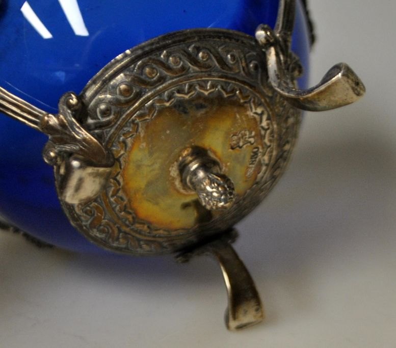 Sukkerkumme i sølv med cobolt blå indsats i glas, 19. årh. Dekoreret me Baccus og ranker. Stemplet.: 830  og utydeligt mestermærke. H.: 8 cm. Dia.: 8,2 cm. Vægt sølv: 117 gram.
