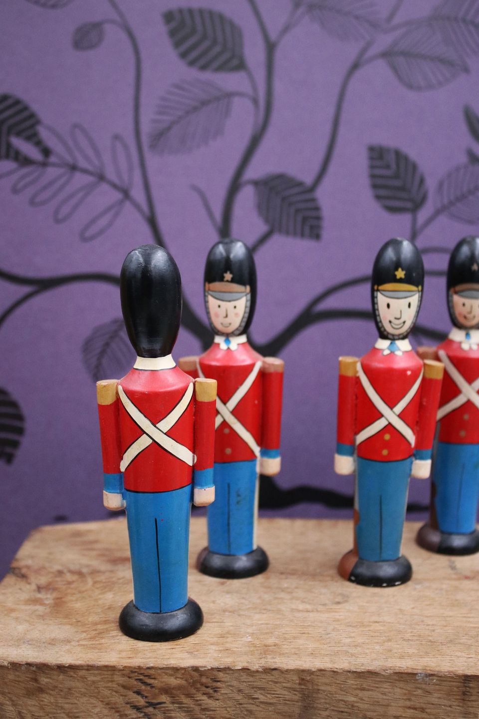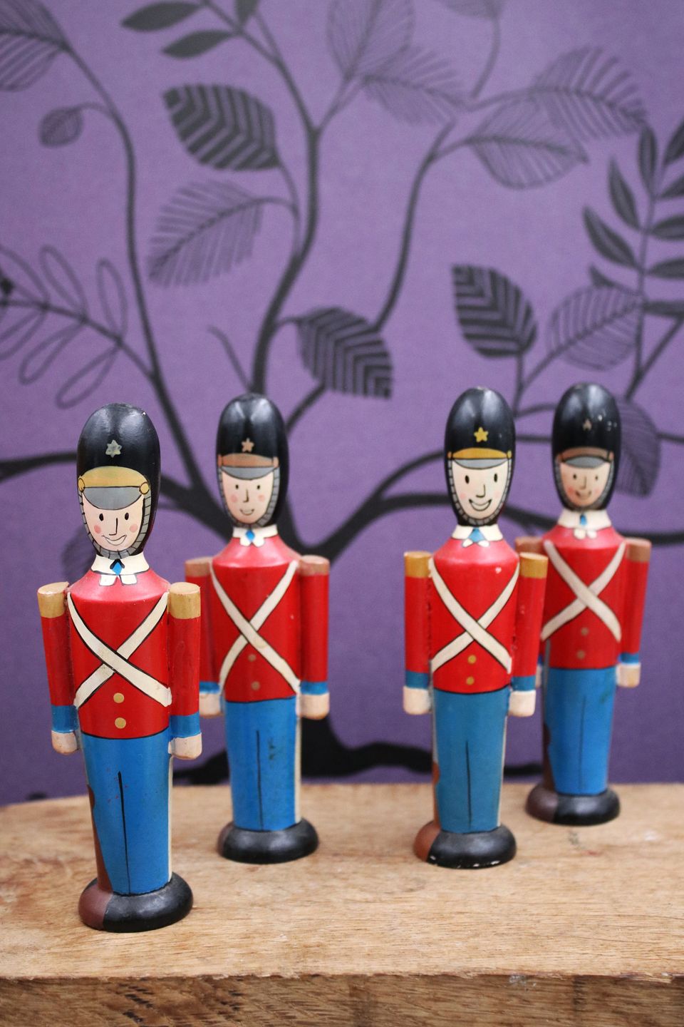 Dekorative , gamle Gardehusarer i fuld uniform i bemalet træ.