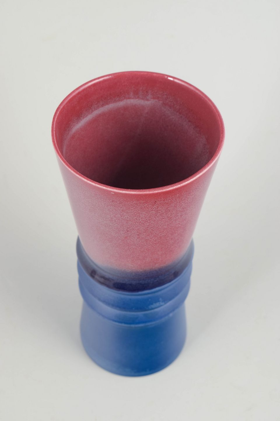 Skulpturelt formet vase i drejet stentøj med markant silhuet. Udført med blank glasur i dybe blå nuancer nederst og rødviolet overgang øverst, typisk for eksperimenterende skandinavisk studiokeramik fra 1960’erne. Det trinvise midterparti giver et arkitektonisk og modernistisk udtryk.