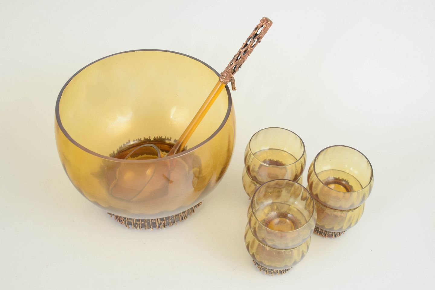 Punchbowlesæt i ravfarvet mundblæst kunstglas med karakteristisk metalfod, bestående af stor punchbowle, 6 glas og tilhørende ske. Det skulpturelle design er kendetegnet ved kontrasten mellem det varme glas og den rå, teksturerede metalfod.
