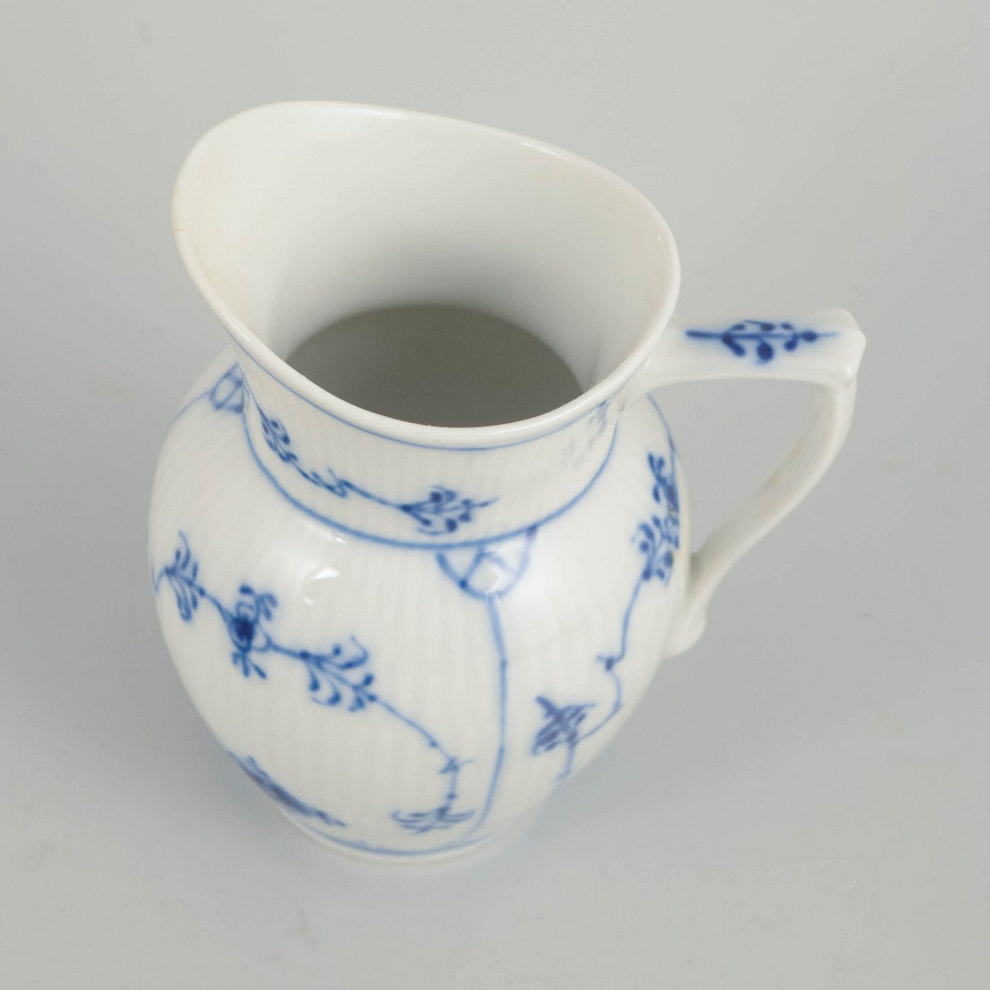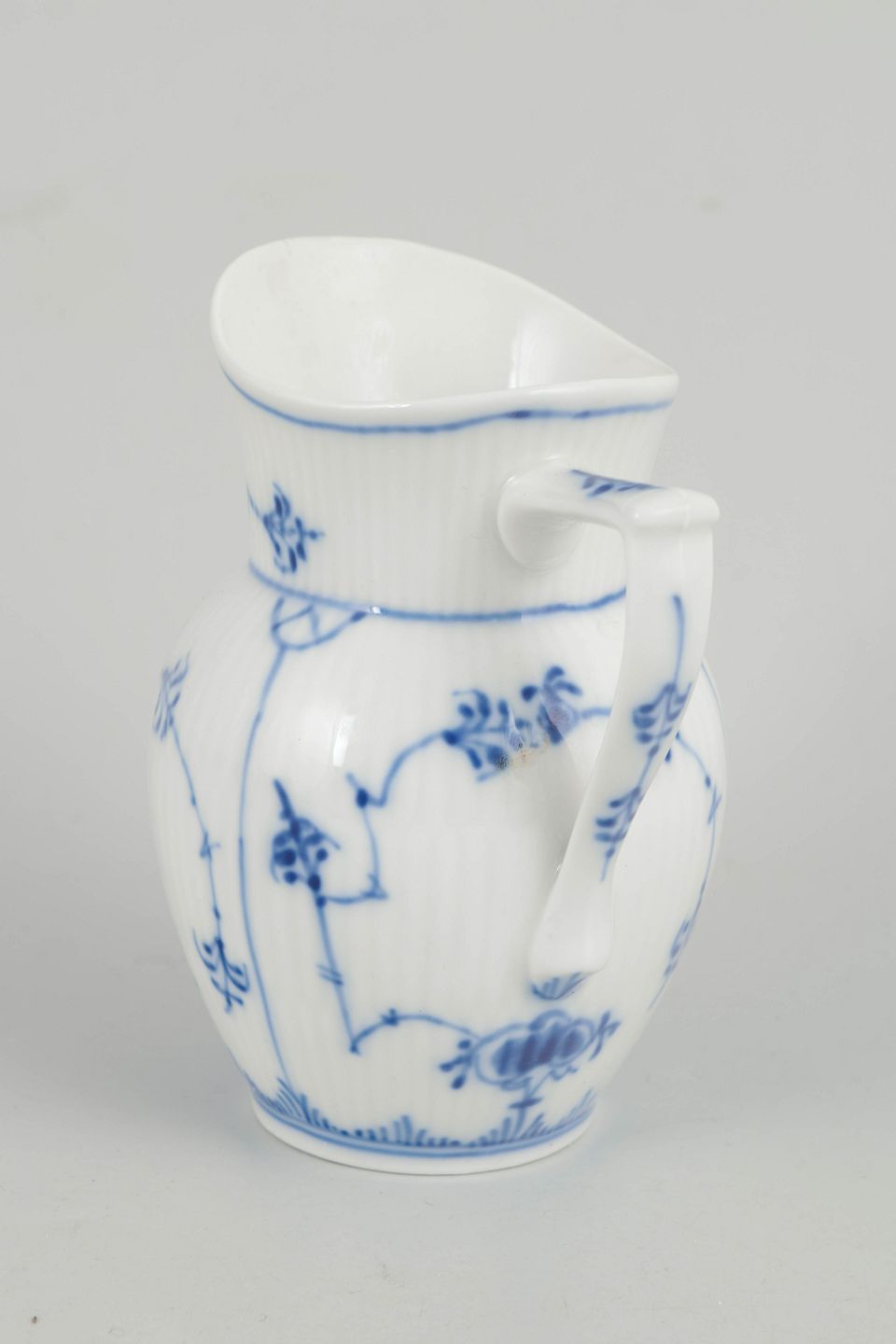 Rillet flødekande i glaseret porcelæn med håndmalet underglasurdekoration i koboltblå. Klassisk form med svunget hældetud og hank.