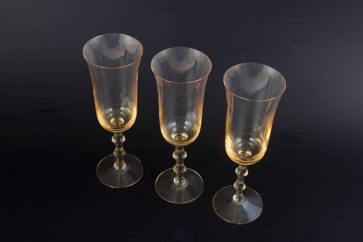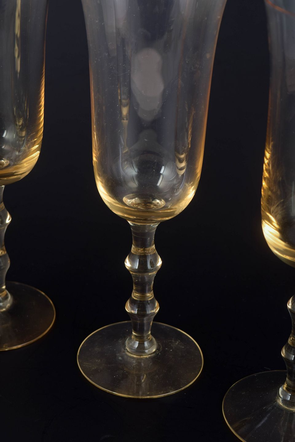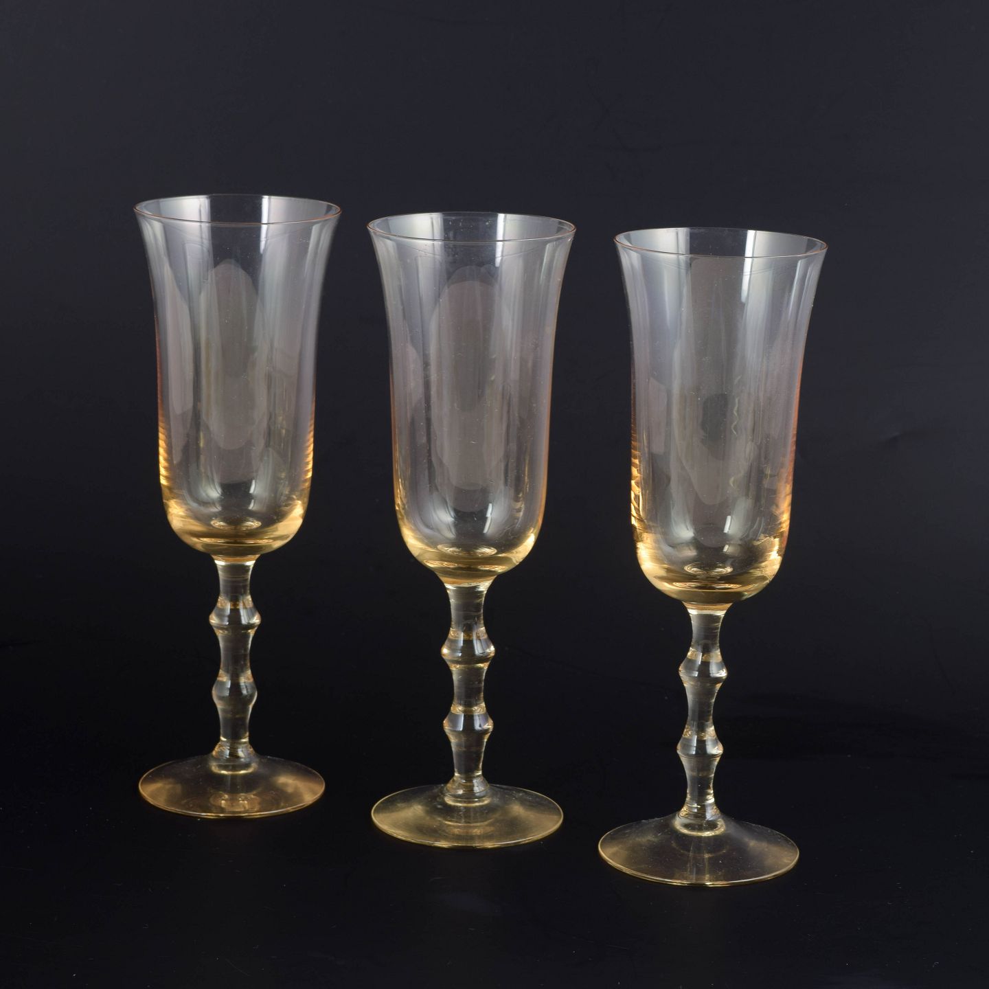 Sæt med tre champagneglas i klart glas med let gylden tone, slank kumme og balusterformet stilk på rund fod. Elegant og tidstypisk skandinavisk formsprog, hvor den varme farvetone giver et mere dekorativt udtryk. Model : “Salut”.