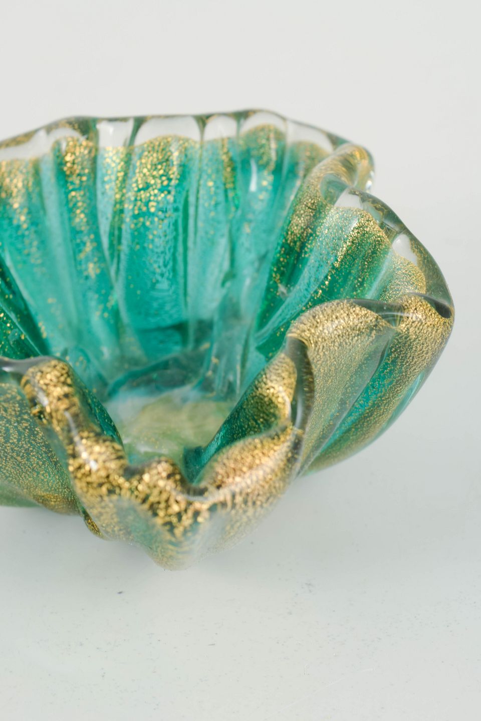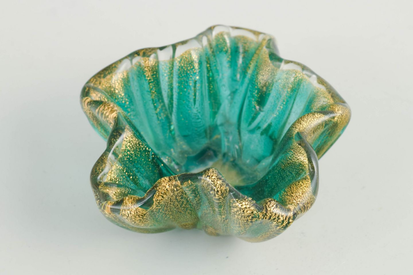 Dekorativ skål i mundblæst glas med organisk, bølget form og rig dekoration i turkisgrønne toner kombineret med gyldne indeslutninger, der giver et levende og stofligt udtryk. Overfladen fremstår med fint spil mellem det transparente glas og de gyldne partikler, typisk for muranesisk glasproduktion i midten af det 20. århundrede. Modellen indgår i en tradition for små kunstglasskåle fremstillet som enkeltstående dekorative objekter.