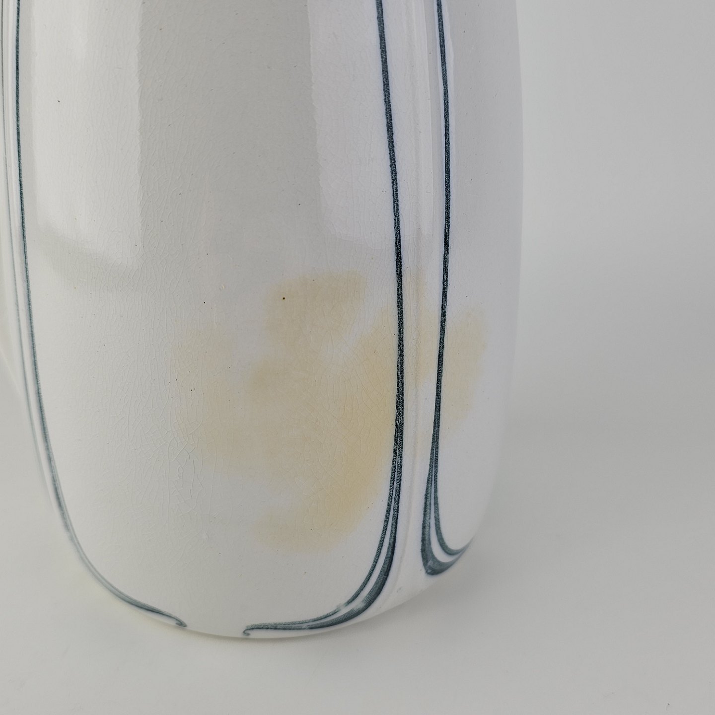 Fremstår med krakeleringer og et misfarvet område på siden