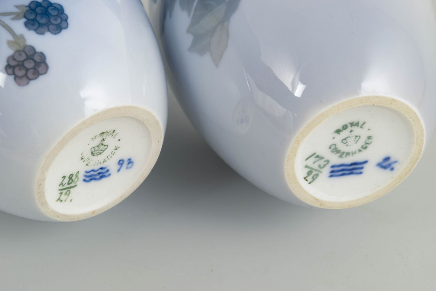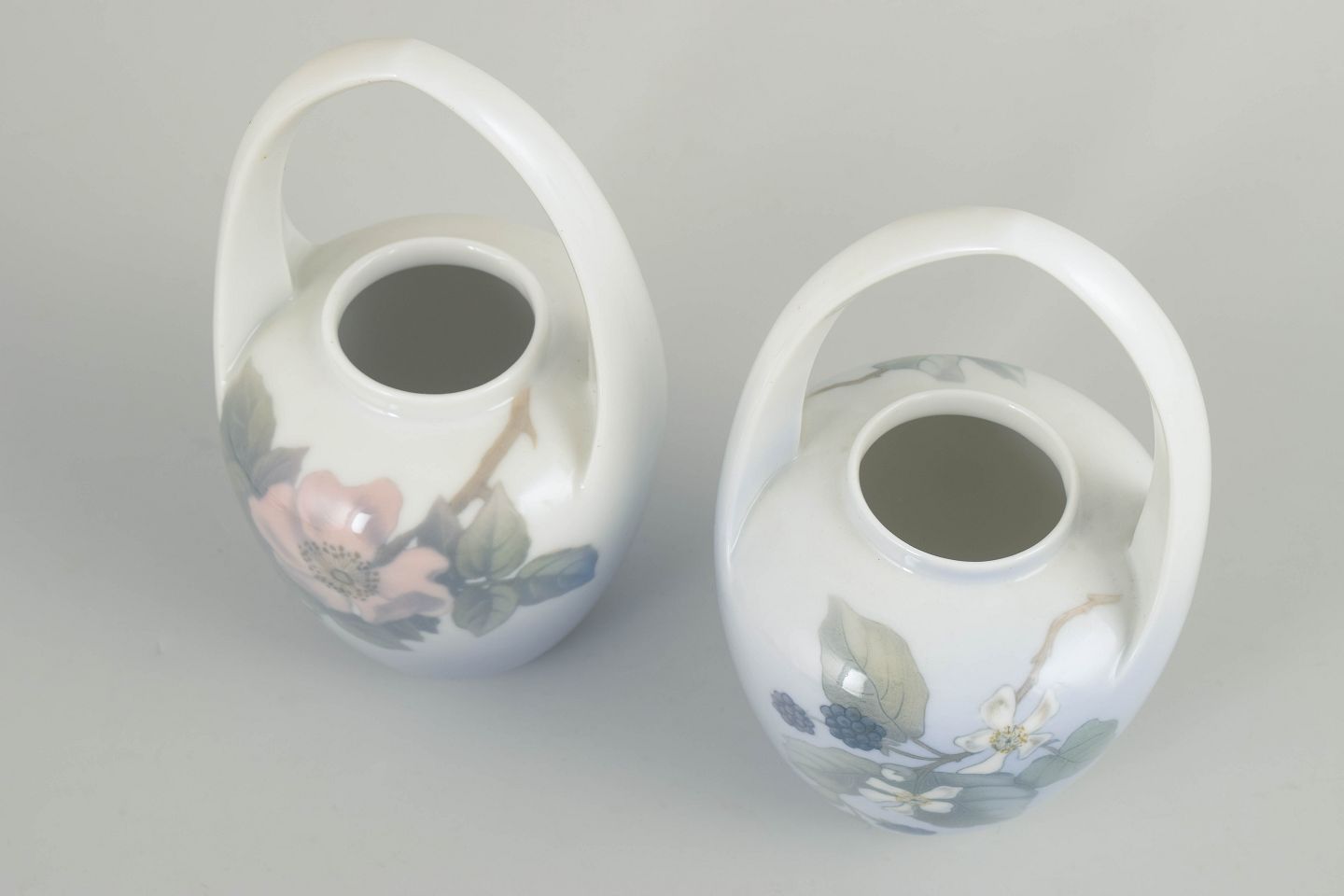 Sæt bestående af to vaser i glaseret porcelæn med integrerede hanke og håndmalet underglasurdekoration i Art Nouveau-stil. Dekorationerne viser blomster- og bærmotiver i afdæmpede blå, grønne og rosa nuancer. Modeller 173/29 og 288/29.