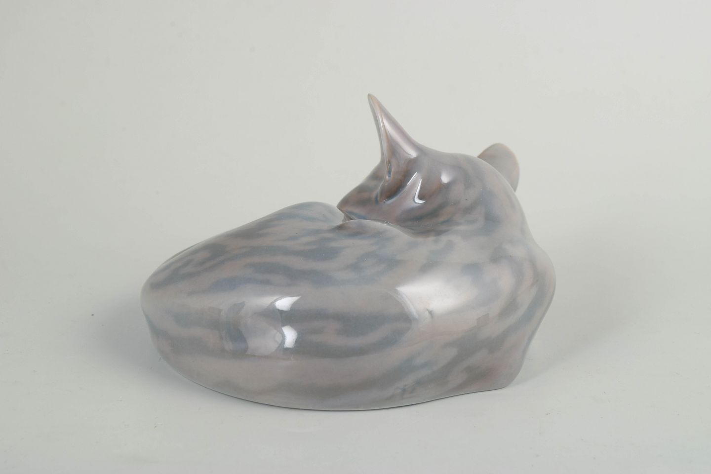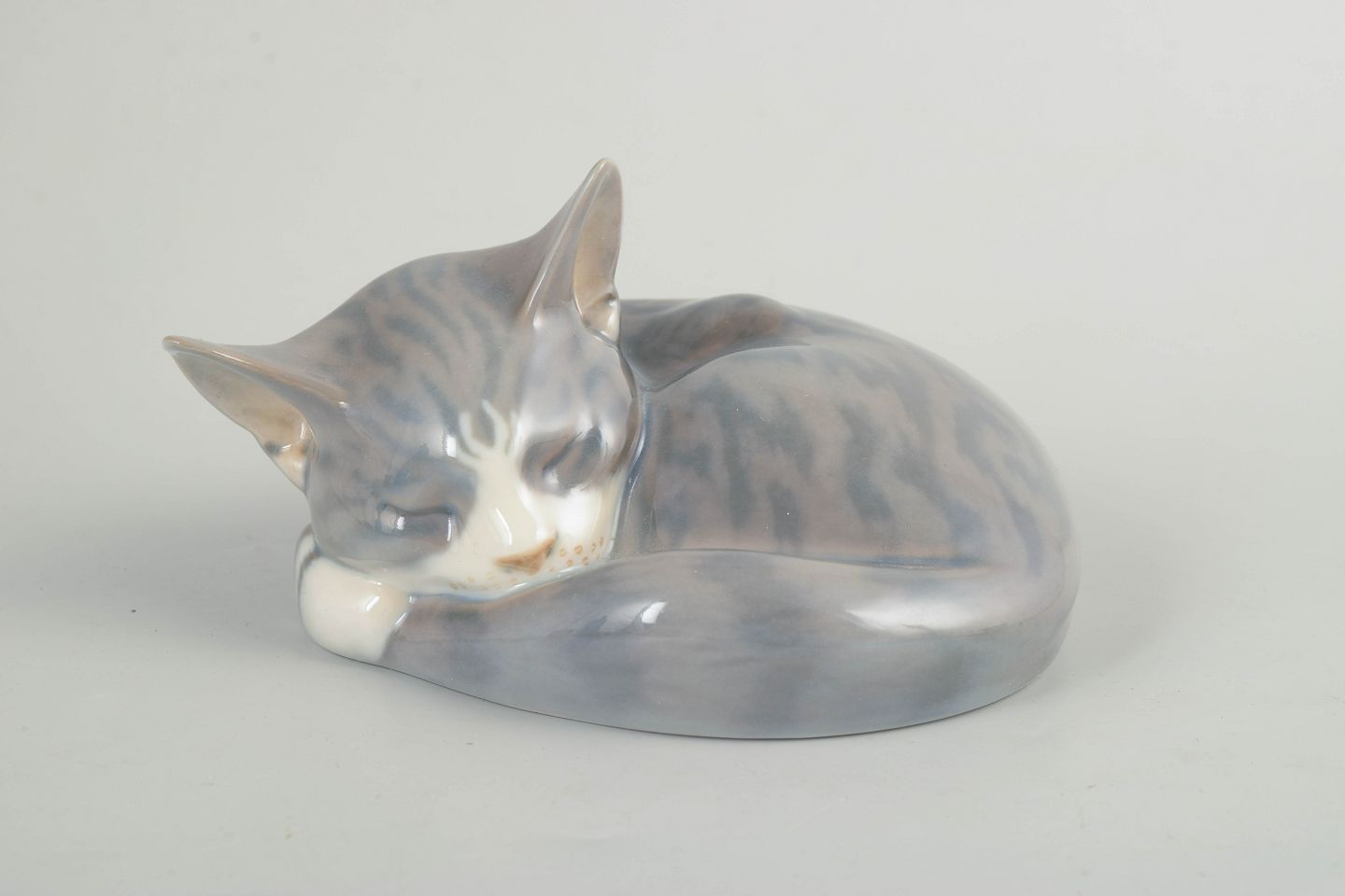 Porcelænsfigur forestillende en sammenrullet, sovende kat med blød modellering og afdæmpet gråhvid glasur med fine nuanceringer. Model 422.