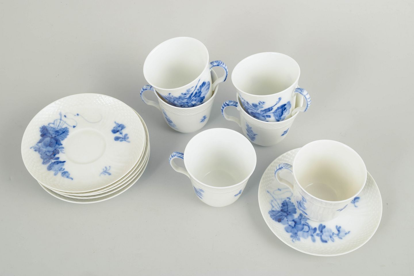 Sæt bestående af seks kaffekopper med tilhørende underkopper i glaseret porcelæn med håndmalet underglasurdekoration i det klassiske blå blomst flettede mønster. Model 10/1546.