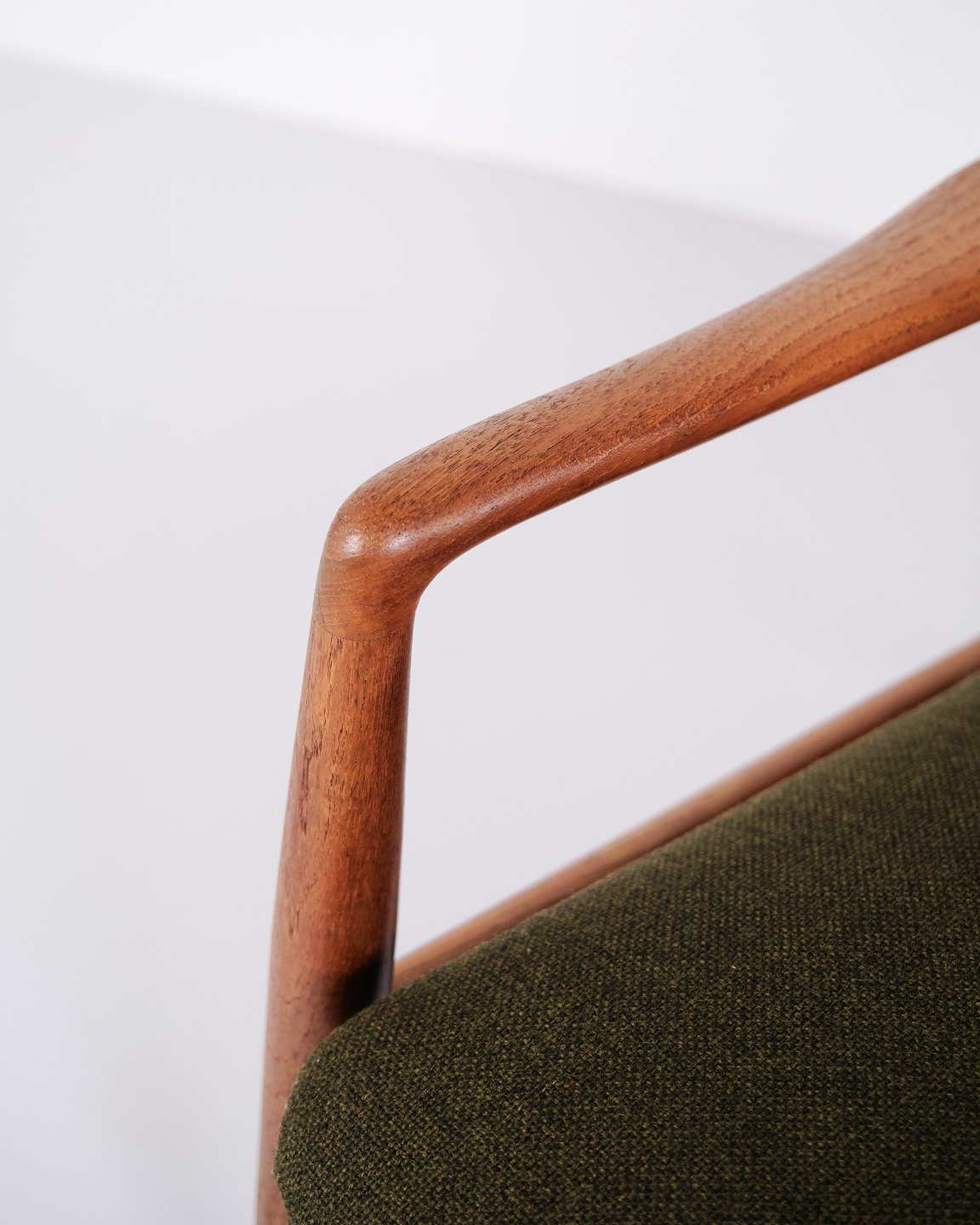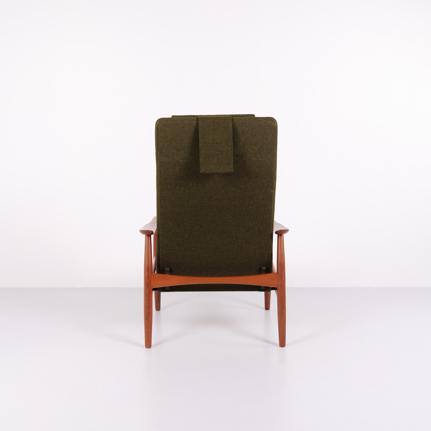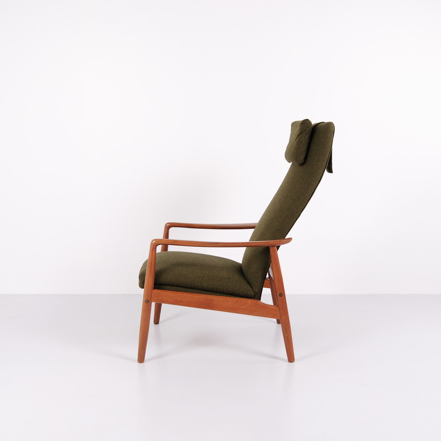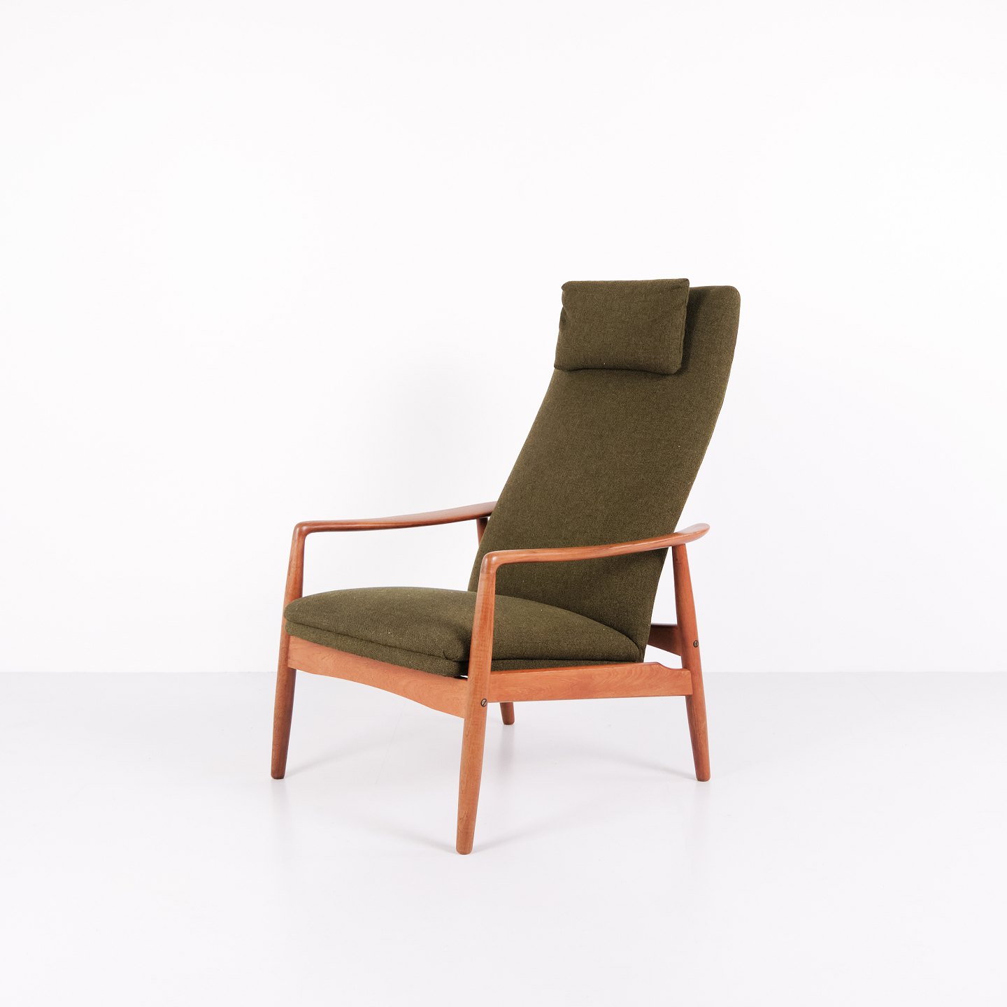 Et par hvilestole med skammel designet af Alf Svensson for Fritz Hansen. Teaktræ og grønt stof. Skandinavisk design fra 1960’erne med fokus på komfort.