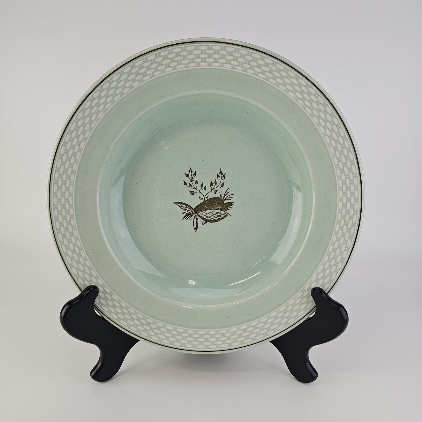 Stel i lysegrøn fajance med natur dekoration og flettet kant